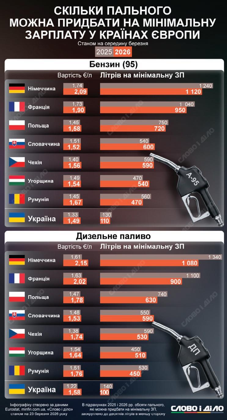 на придбати 600 літрів бензину, у Чехії –590, в Угорщині – 540. У Румунії, де мінімальна зарплата становить 795 євро, можна купити 470 літрів бензину. Найменше бензину купити на мінімалку можна в Україні – 110 літрів. Середня ці-