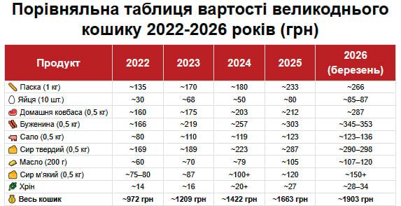 Різниця між мінімальним та преміальним кошиком у 2026 році стала ще відчутнішою: Бюджетний (маркет-плейси): від 1250 грн (паска з мас-маркету, мінімум м'яса).