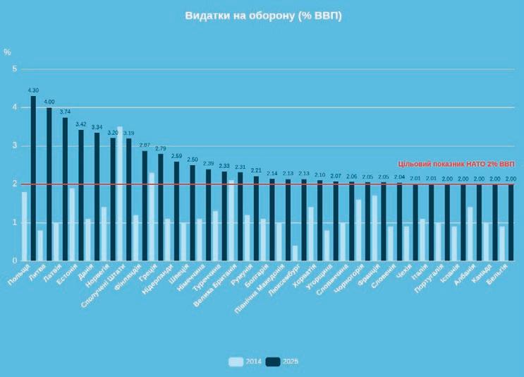 ПОЛЬЩА – В ЛІДЕРАХ На саміті НАТО у 2014 році, який відбувся через кілька місяців після російської анексії Криму, визначили мету витрачати не менше 2% ВВП на