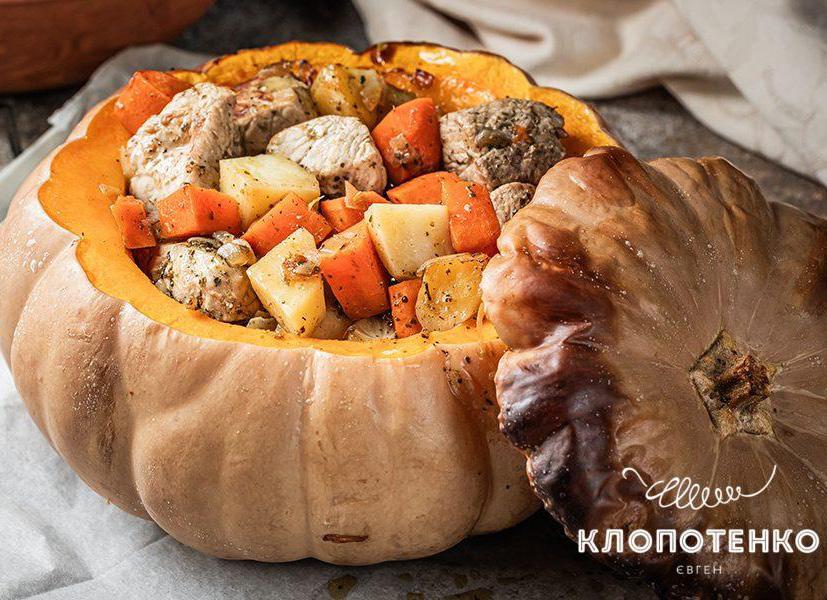 гарбуз, зніміть з нього кришку та перевірте, чи готові овочі – вони повинні бути м’якими та легко проколюватися виделкою. Якщо страва не готова, поверніть її в духовку ще на 15-20 хв.