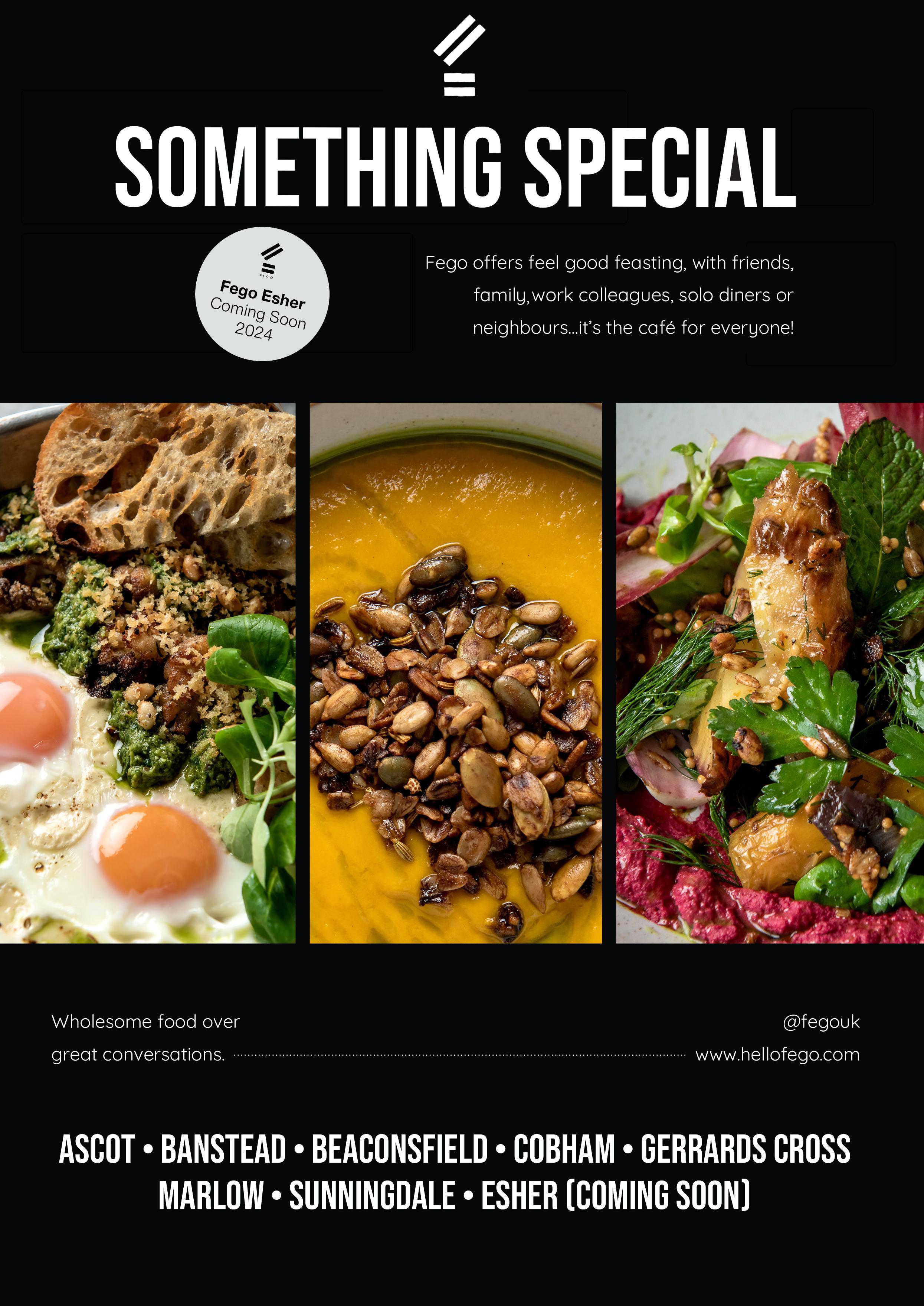 Award-winning South African-inspired café Fego, with 7 stunning locations in Cobham, Banstead, Ascot, Sunningdale, Beaconsfield, Marlow and Gerrards Cross - is now launching their eighth café in the beautiful Surrey town of Esher. Serving the most delicious breakfast, brunch and lunch options using only the finest and freshest ingredients from the best in local produce, Fego was the winner of the Surrey Awards 2023 for Best Café as voted for by 18,500 Surrey residents. We can’t wait to pay the new Esher café a visit. See www.hellofego. com to make a booking at your local Fego now.