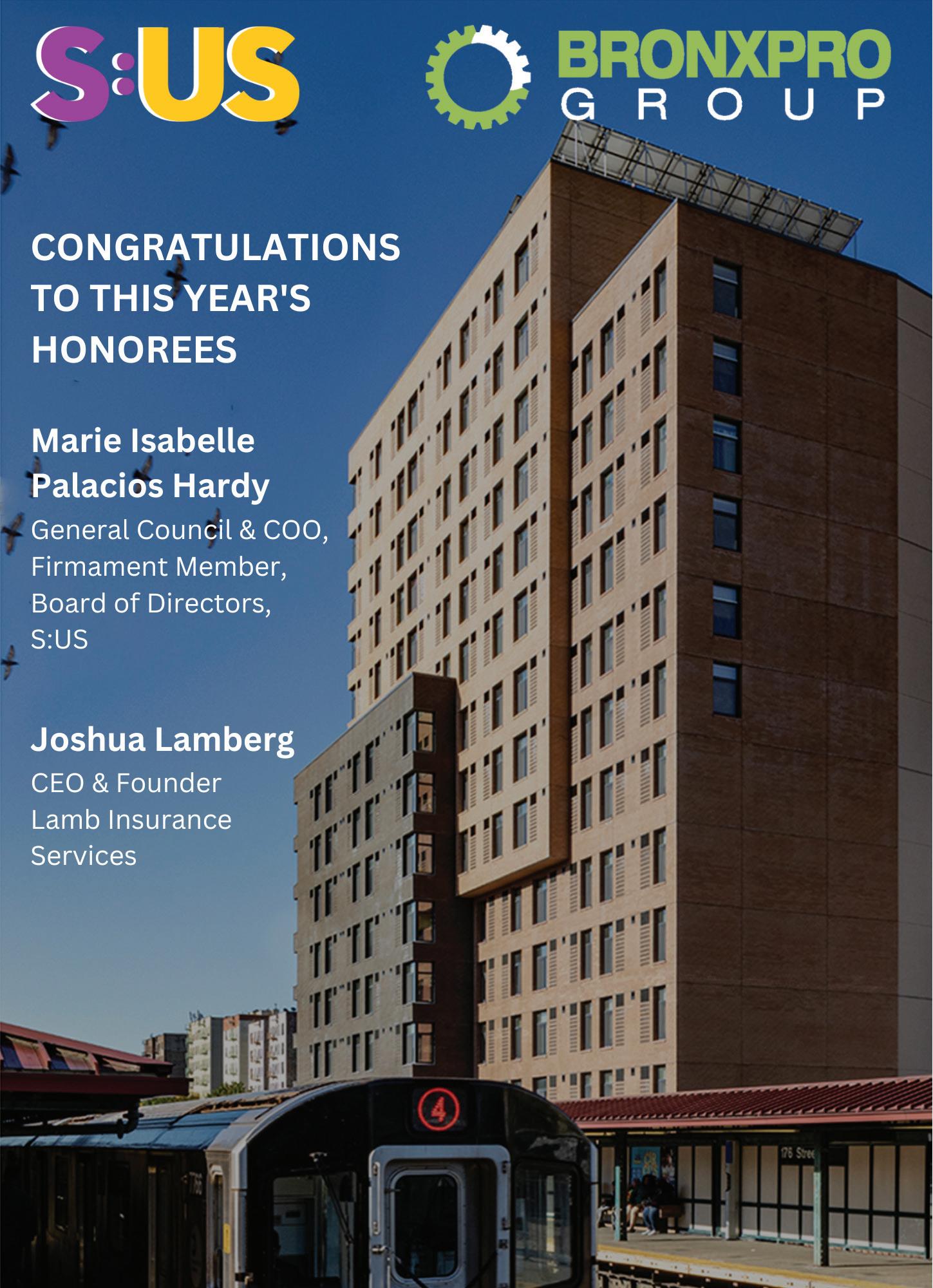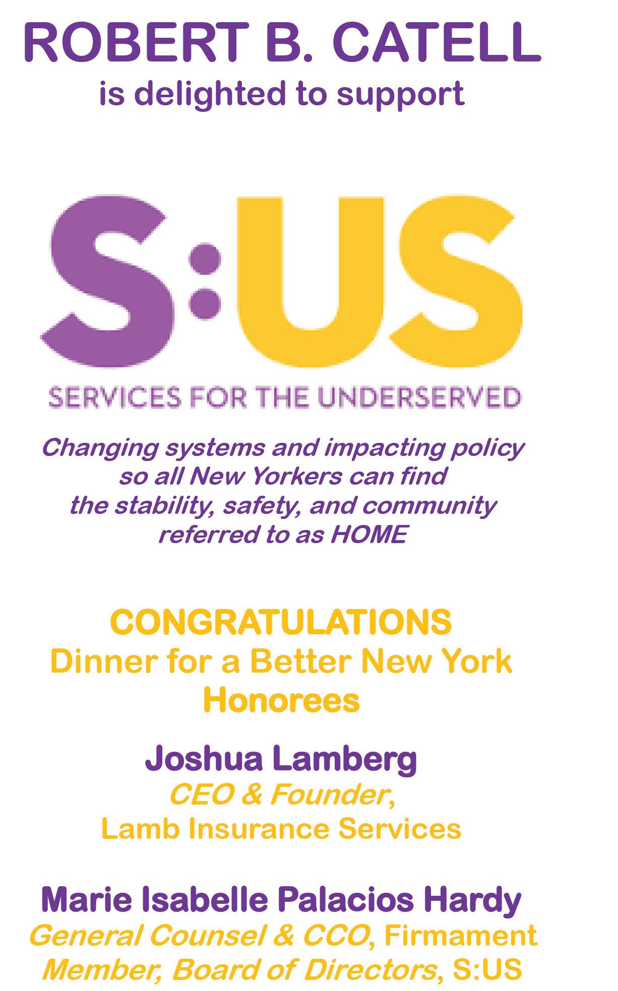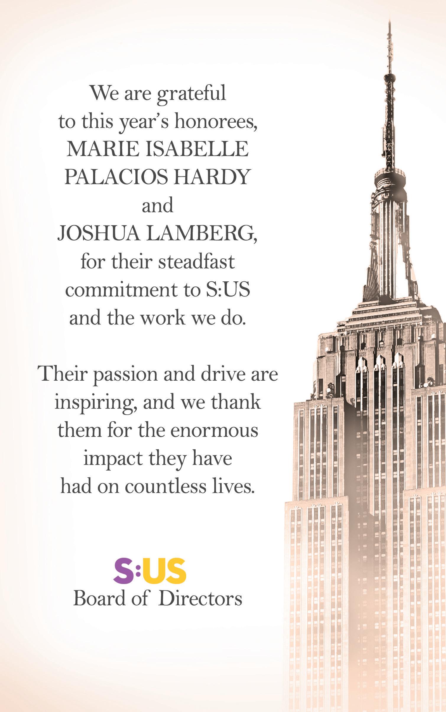 Thank you for joining us this evening at our Dinner for a Better New York. We are thrilled to be honoring S:US Board Member, Marie Isabelle Palacios Hardy, and CEO and Founder of Lamb Insurance Services, Joshua Lamberg, for all they do to support our mission. Also, many thanks to our Board of Directors, including Andrew Zimmern, all of our participating chefs, donors and everyone that made this night possible.