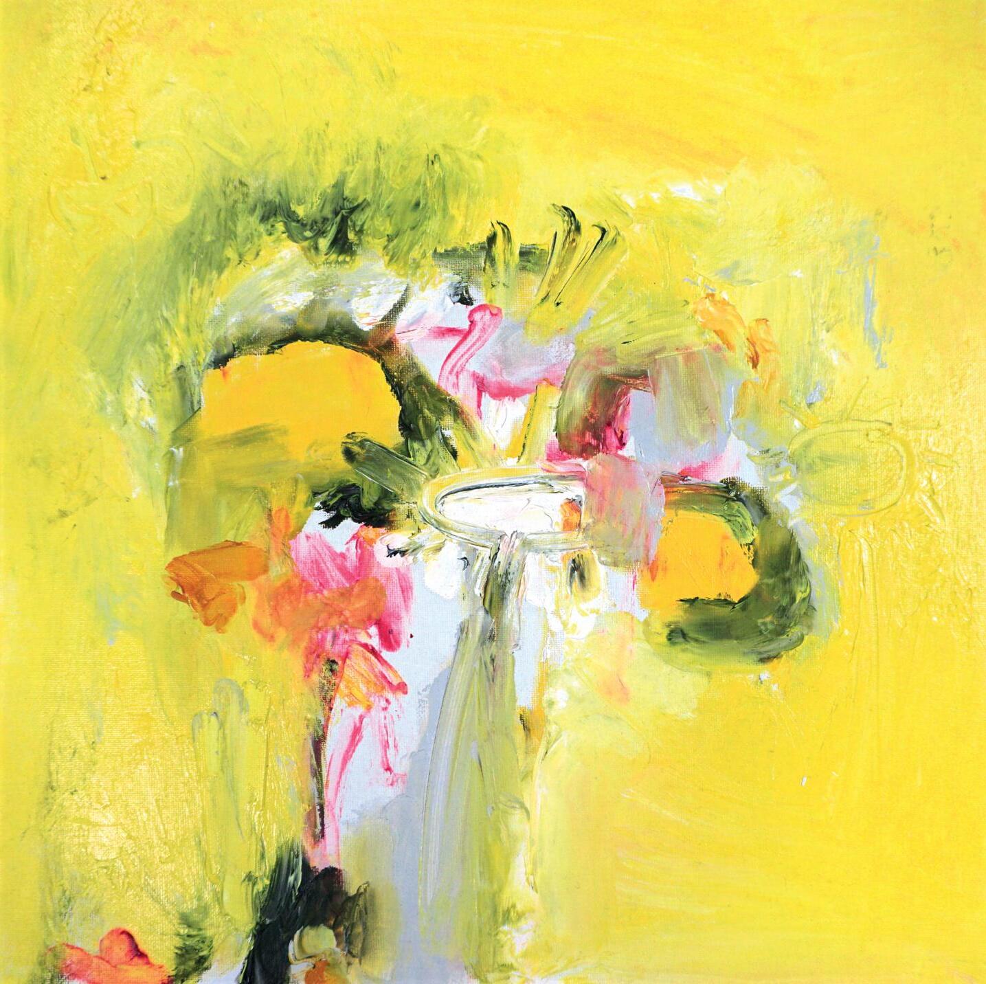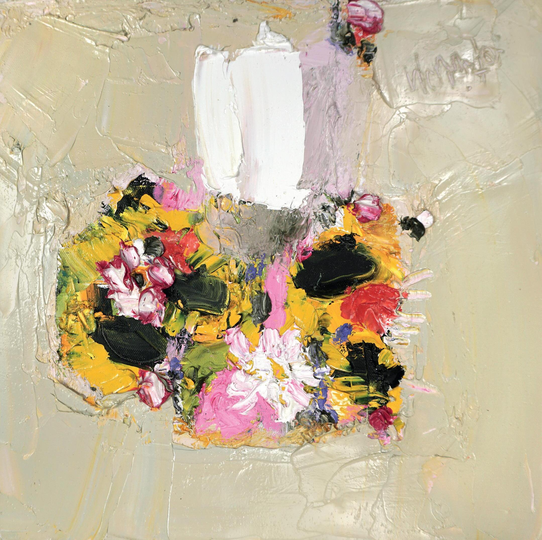 ‘Peony, Sunflower and Wildflowers against Yellow Grey’ Oil, Canvas Size 40 x 40cm