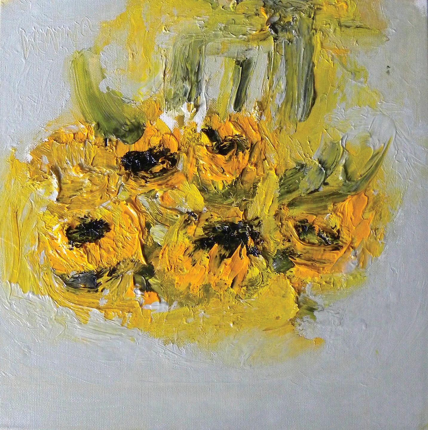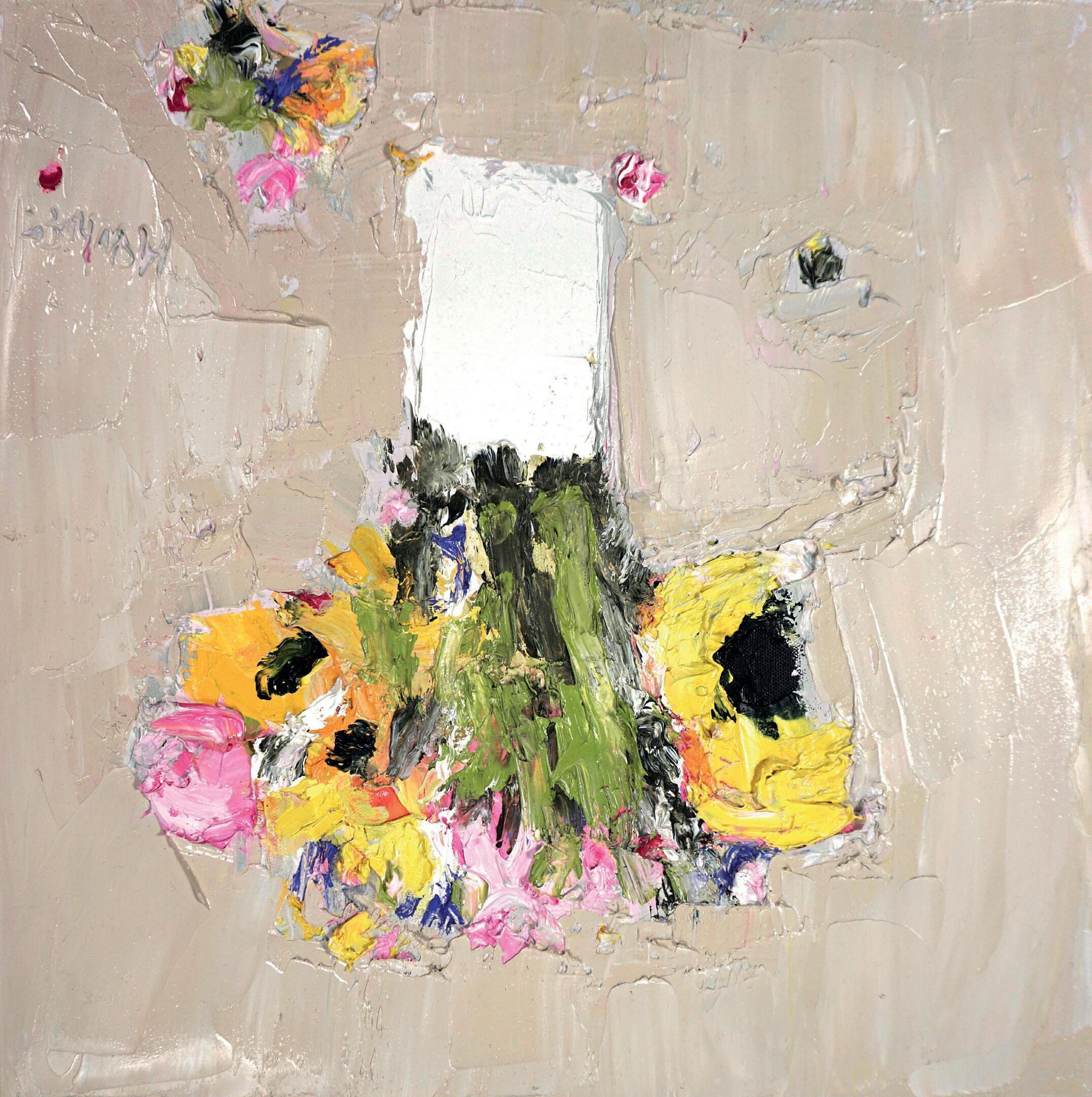 ‘Sunflowers against Yellow Grey’ Oil, Canvas Size 40 x 40cm