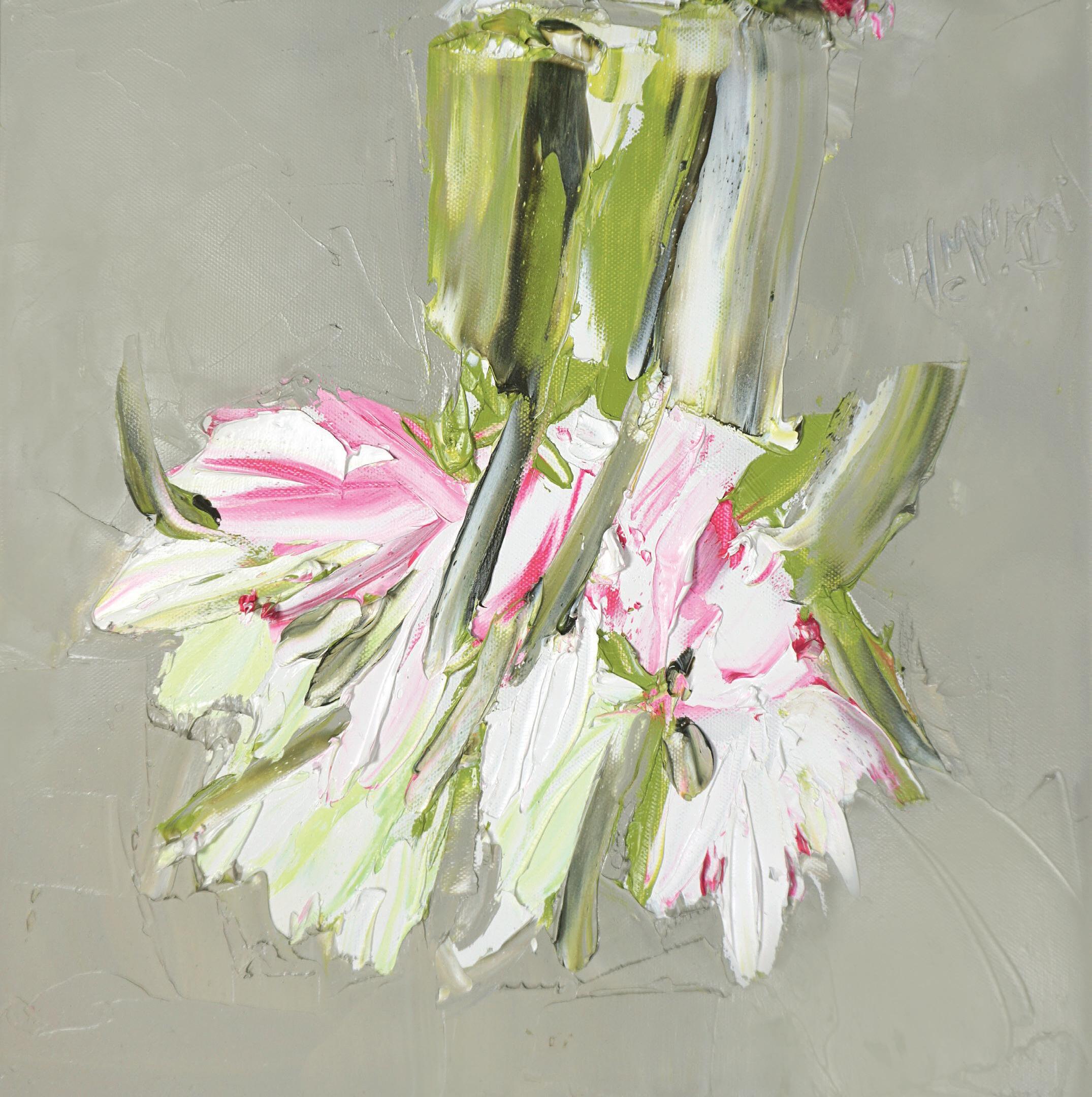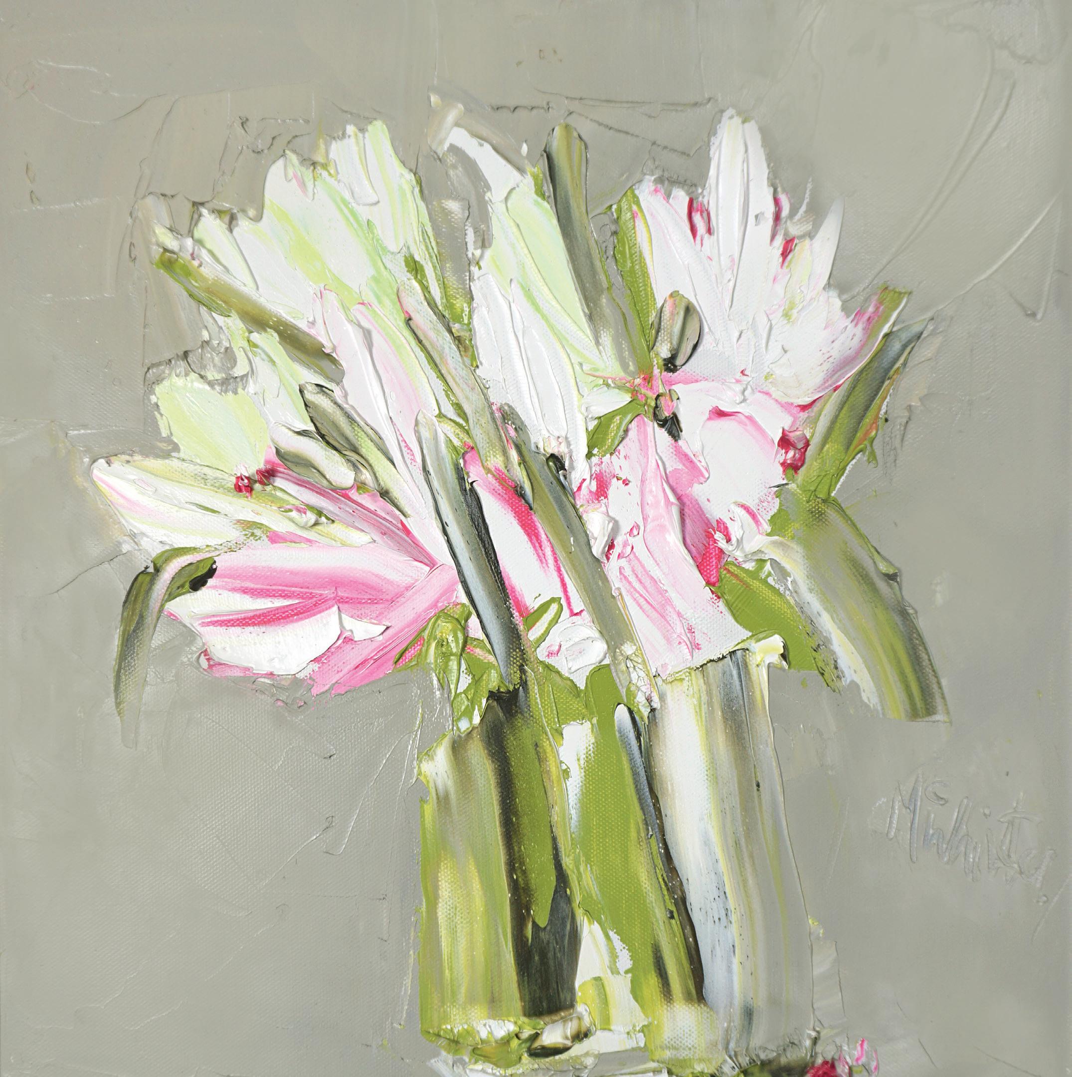 ‘White and Pink Lilies against Warm Umber’ Oil, Canvas Size 40 x 40cm