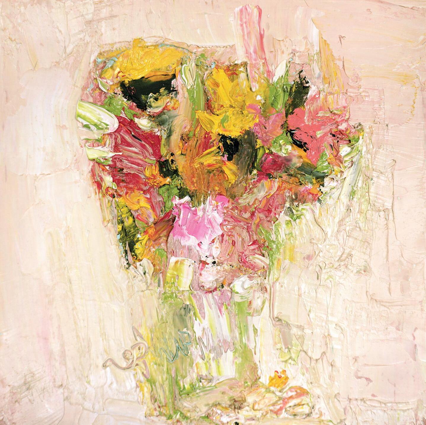 ‘Peony, Sunflower and Yarrow against Oyster Pink’ Oil, Canvas Size 40 x 40cm