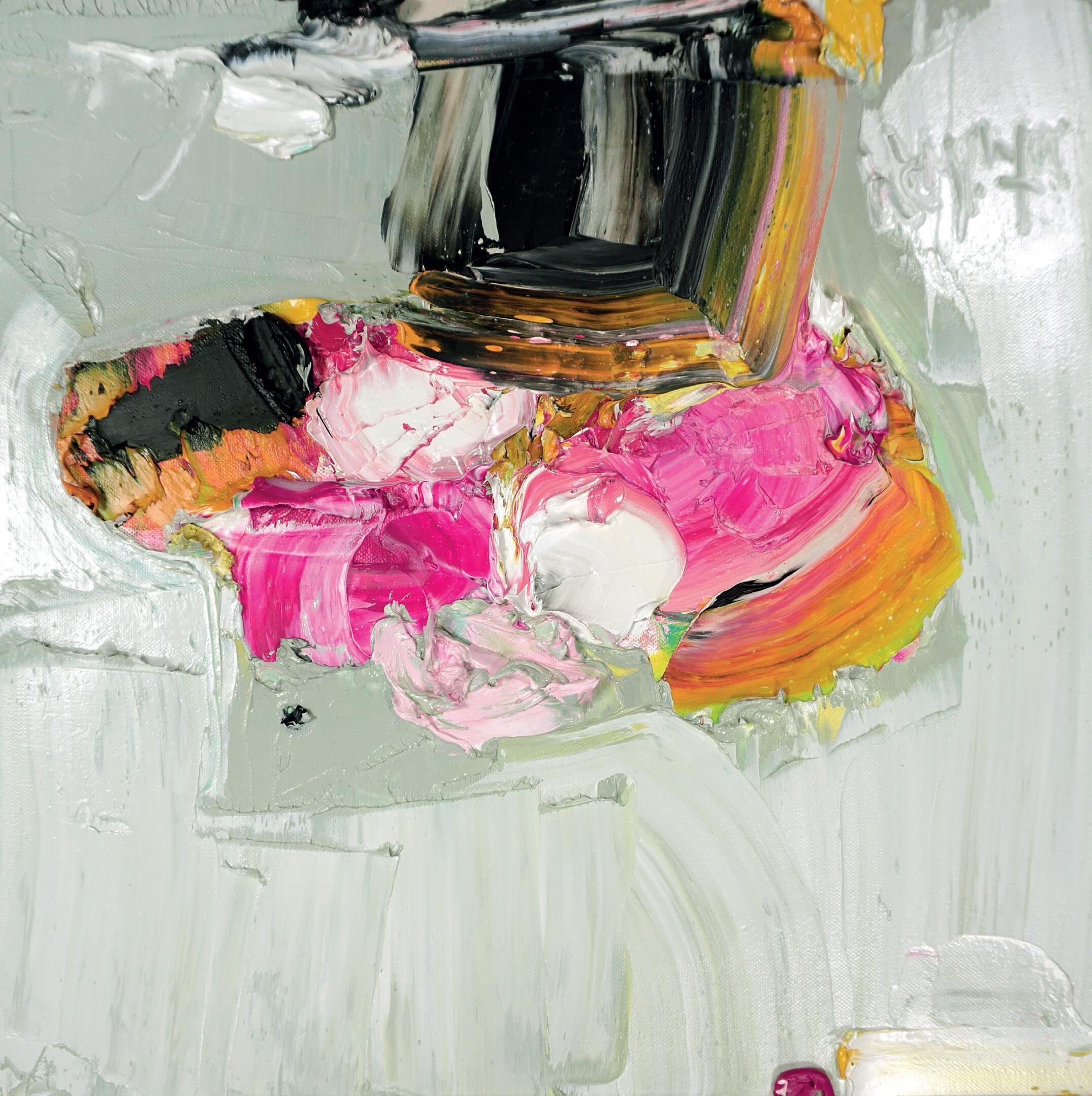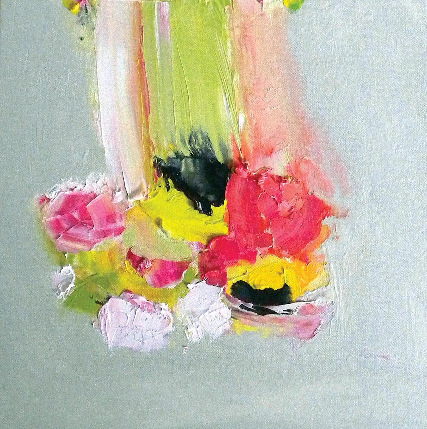 These include two of the earliest in the series: the vibrant, lusciously painted ‘September Sunflowers’ and ‘September Sweet Peas’, the epitome of restraint and delicacy, depicting in pastel hues a freshly picked posy from her mother’s garden in Dumfries; the delectable ‘Cirsium and Wild Daisy’, in which the deep purple flower heads of the thistles jostle with those of the white and yellow daisies and even appear to sway in unison; the spectacular ‘Superstar Rose, Sunflower, Moon Daisy and Harebell’, where each of their scintillating blooms competes for our attention; the sumptuous ‘Sunflower, Chicory and Coralroot’; the modest, quietly contemplative ‘Dad’s Peace Roses’; the exuberant ‘Garden Peonies Deep Fuchsia’; and finally ‘Akasha’s Flowers’, whose colour range is redolent of early Renoir and thus forges a perfect link with Alison’s smaller series of paintings inspired by artists’ palettes, a theme she is already intending to develop.