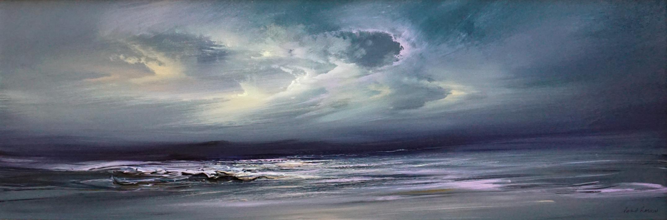 Raskinâs paintings are deeply rooted in the Scottish landscape. Expansive skies, shifting weather, mist-softened hillsides and reflective waters dominate his compositions. His intuitive use of colour, often working with a restrained and harmonious palette, creates works that radiate peace, stillness and tranquillity. Light and atmosphere are central to his practice, and his paintings possess a quiet, meditative quality that invites prolonged looking.