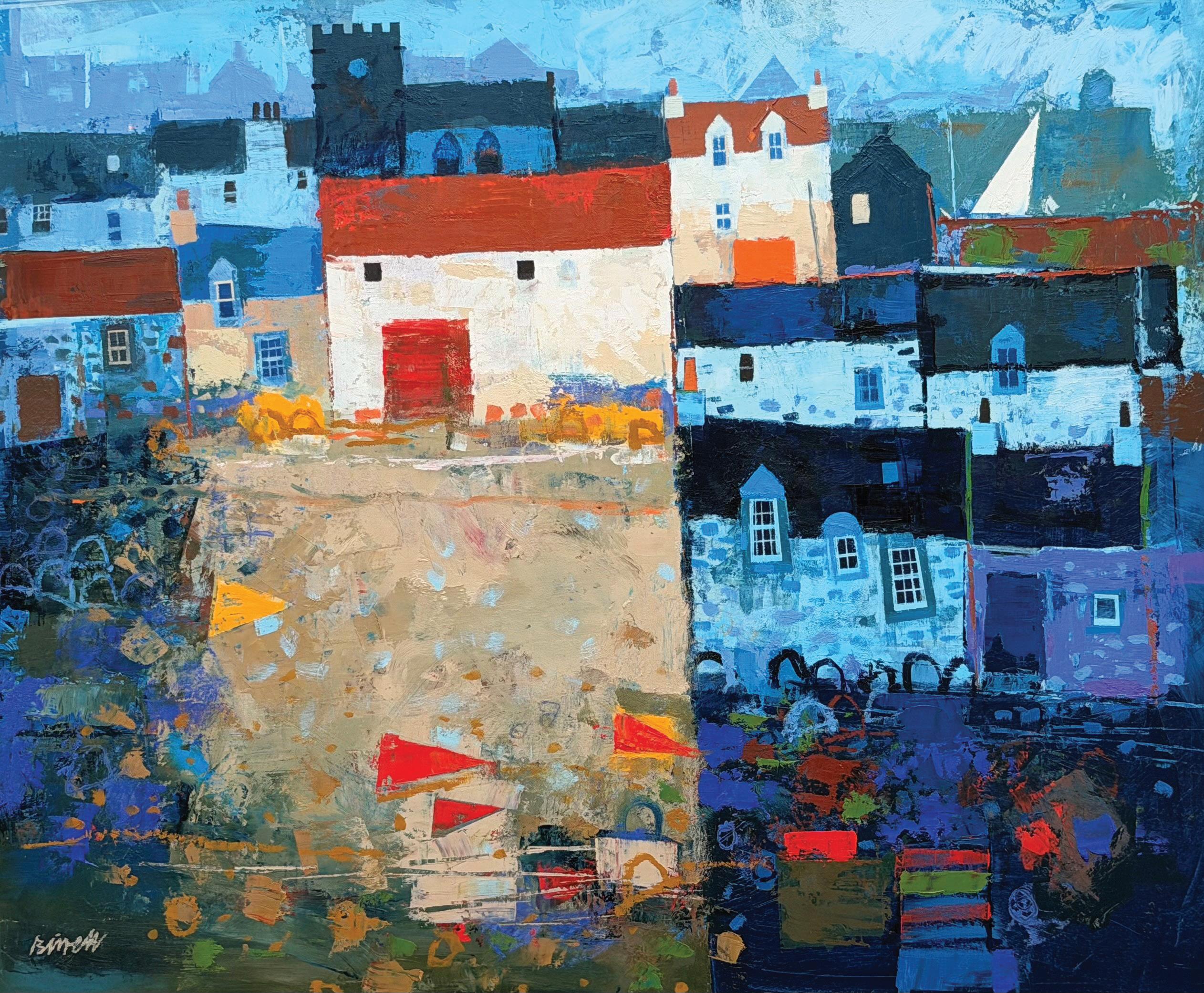 Known for his bold, expressive interpretations of Scotlandâs architecture and coastal towns, particularly the fishing villages of the East Neuk of Fife - a place he first encountered during his student years - this area became a lasting source of inspiration, its harbours and cottages providing recurring motifs throughout his work.