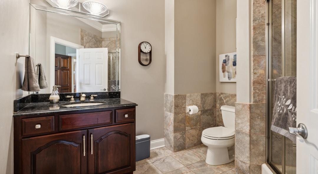 The Jack & Jill Bath offers stylish marble tile flooring, crisp white cabinetry with granite countertop and dual sinks, brushed satin nickel faucets, crown molding, and a beveled mirror.