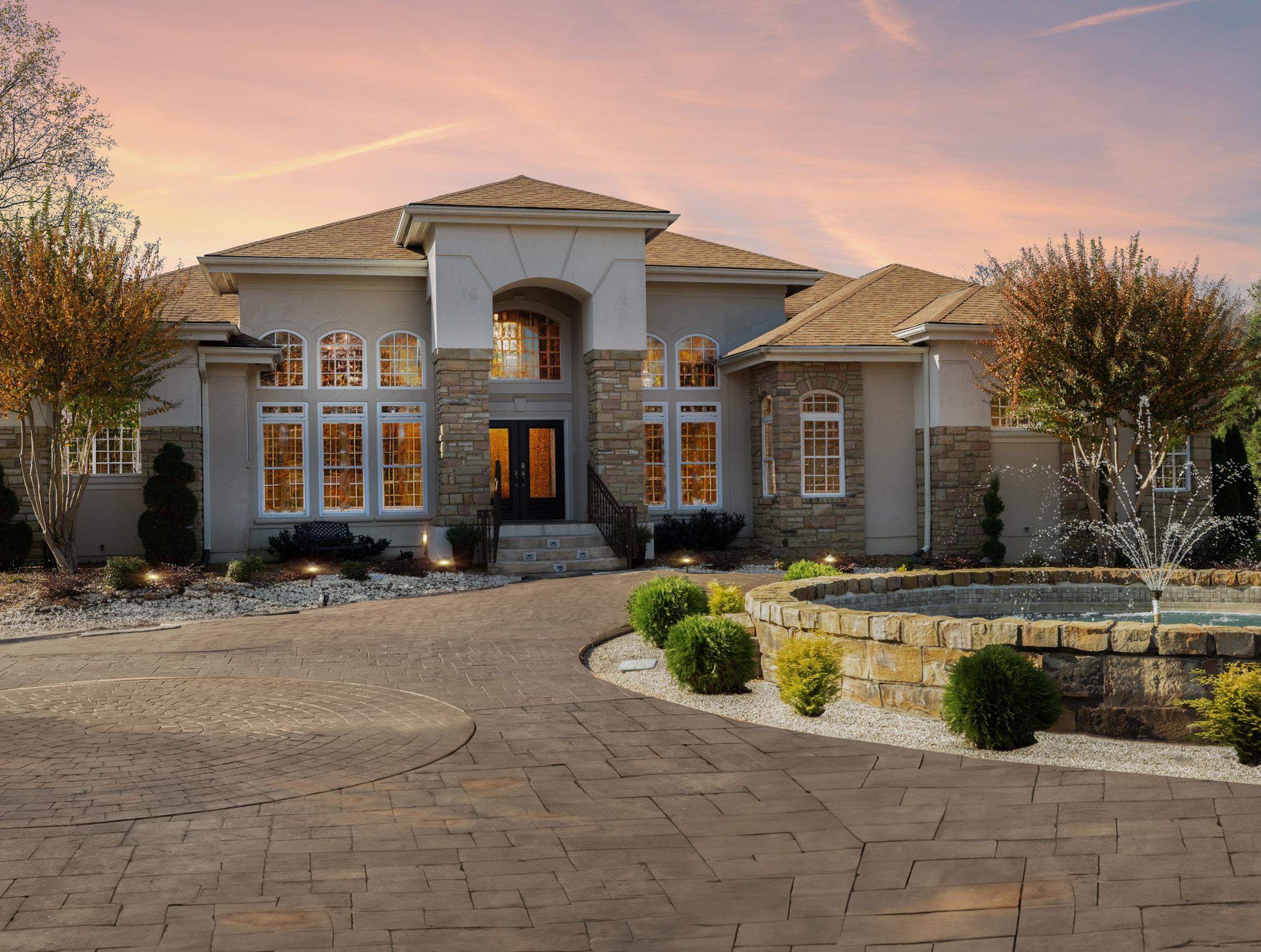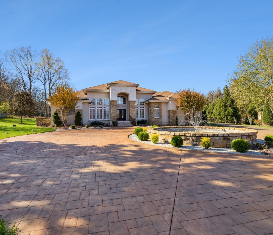 As you are ushered through the private gated entrance, a stunning view of the house greets you with a stamped concrete circular drive and lush landscaping. The circular water fountain creates a substantial visual centerpiece that adds a grand, elegant touch to the landscape and produces a noticeable, calming sound of running water making a statement upon arrival.