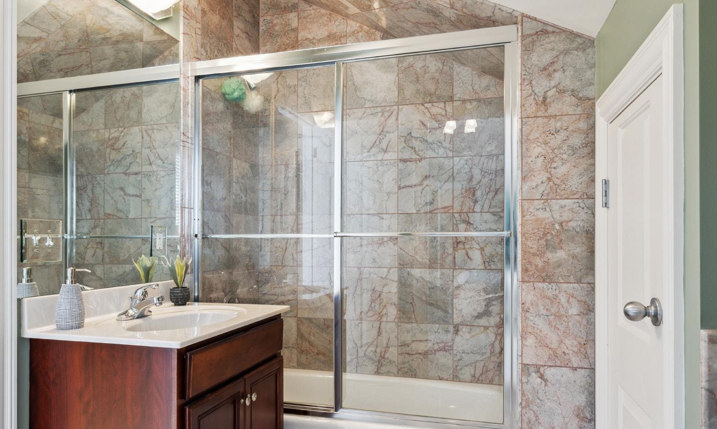 Bedroom #2 & #3. What sets this room apart is a walk-in closet and a comfortable space to lounge next to a double window with transom above that welcomes a lot of natural light. The Ensuite Bath features a tub/shower combo with marble surround, built-in shampoo ledge, brushed satin nickel faucets, sliding glass door, and a beveled mirror.