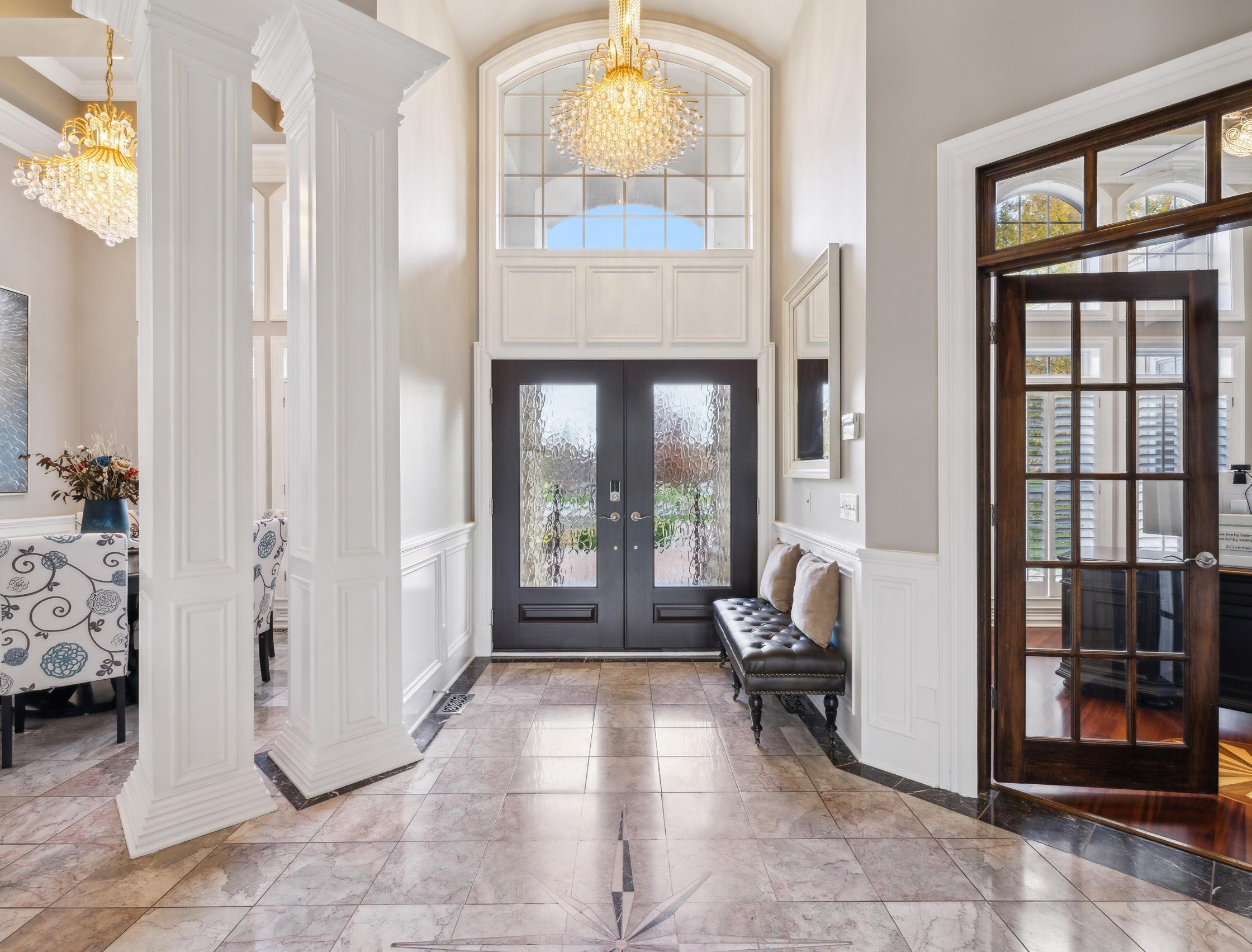 This lovely Foyer welcomes you in with charming details including heavily trimmed columns, beautiful crystal chandelier, high ceilings, wainscoting and chair rail, marble flooring, and a rain glass double door entry with arched window above.