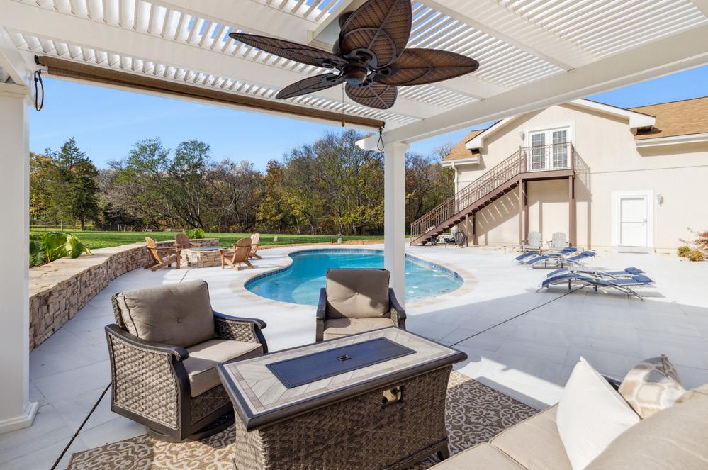 Welcome to your private oasis! Enjoy scenic views from your Large Covered Lanai boasting travertine flooring, an iron railing, built-in speakers, cameras, and Pool bath access overlooking a kidney shaped Pool. If you have a large family or enjoy entertaining, the spacious Pool area provides ample deck space with a gas line for a future outdoor kitchen. Imagine grilling out with friends while keeping an eye on swimmers. The gazebo area provides a lounging spot with a ceiling fan to provide a respite from the hot summer sun. The built-in firepit area is perfect for knocking off the chill on cooler autumn nights or making smores. All of this backs a lush lawn with greenspace beyond. The serene open field provides an opportunity for spotting wildlife on a regular basis. What an idyllic setting!