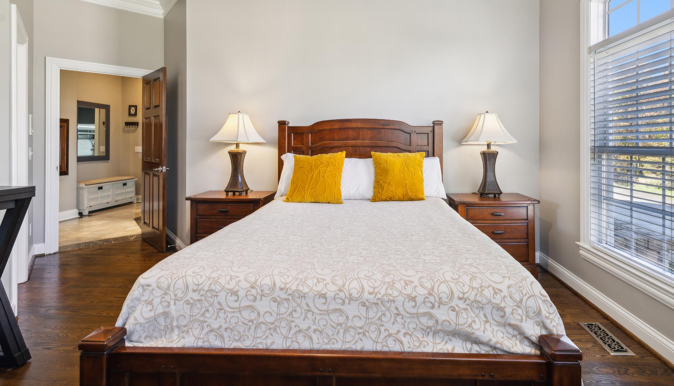 Your retreat continues to the Primary Bathroom. Luxurious amenities include large tile flooring, separate cherry vanities with granite counters, beveled mirrors, and a ceiling fan with crystal chandelier light. Wash away a hard day in the walk-in shower with bench seat, rain head and handheld or the free standing tub with brushed satin nickel floor faucet, and handheld. A privacy window brings in natural light.