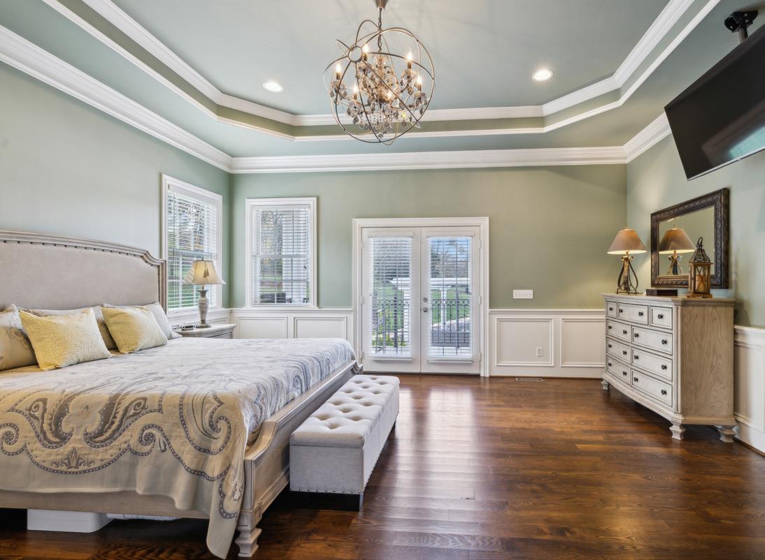 Experience tranquility in the Primary Bedroom, conveniently located on the Main Level. This soothing retreat is the perfect place to relax and unwind after a long day. Elegant features include wood floors, octagonal tray ceiling highlighted by a Restoration Hardware light fixture, speakers, wainscoting and chair rail, and a TV mount at the ceiling. The Dual closets also feature hardwood floors and wood shelving. Easy access to the Covered Lanai offers the perfect spot to drink your morning coffee or a glass of wine while overlooking the Pool.