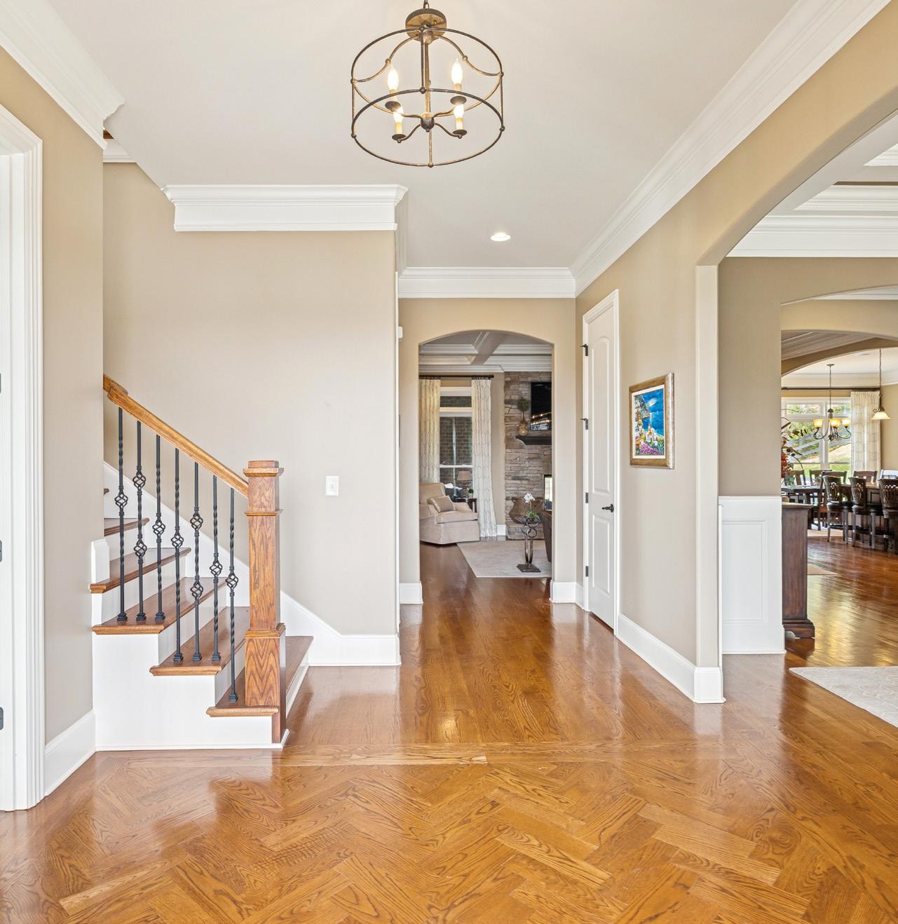 As you approach this exquisite residence, the newly sealed driveway gently guides you toward an entry that radiates both elegance and warmth. The pathway, a masterful blend of warm-toned slate tiles framed by cool gray accents and bordered by meticulously crafted paver-lined landscaping beds, sets the tone for the attention to detail that awaits inside. Subtle exterior front illumination, set on a timer to cast a welcoming glow each evening, works in harmony with traditional gas porch lights ignited automatically at dusk. An Arlo video doorbell, discreetly integrated beside the entry, enhances both convenience and security without detracting from the home’s refined aesthetic. Step onto the stone front porch, where a stained beadboard ceiling adds a touch of timeless charm, and the double iron front doors, Energy Star rated for efficiency, open to a world of refined luxury. Every element of this entrance is thoughtfully designed to invite, impress, and create a sense of serene sophistication before you even cross the threshold.