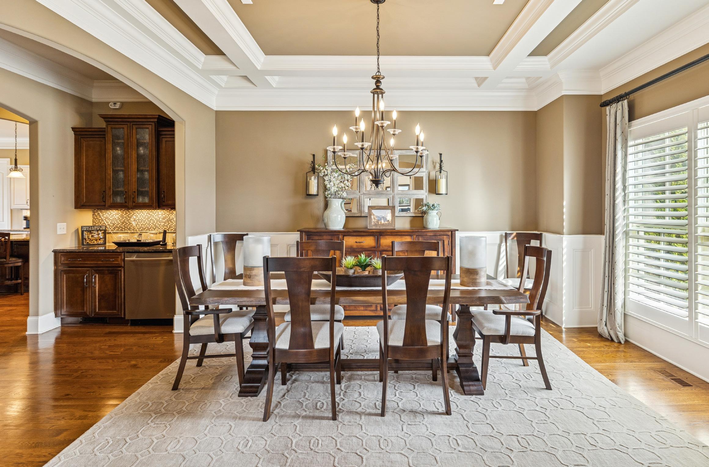 • Formal dining with coffered ceiling, wainscot, plantation shutters & audio wiring