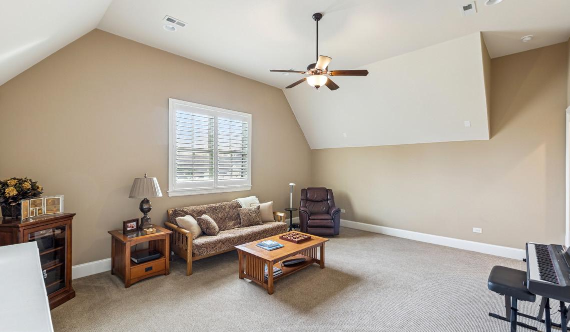 A few steps down from the upper-level hallway leads to the spacious Bonus Room, a versatile area designed to accommodate a variety of uses—from a media retreat or game room to a creative hobby space. A tall vaulted ceiling with recessed lighting and a ceiling fan with integrated light enhances the open feel of the room, while pre-wiring for surround sound allows you to easily create the perfect ambiance for movie nights or immersive entertainment. Berber carpeting adds warmth and comfort underfoot, and a double window with plantation shutters maintains privacy. A built-in entertainment center with cabinet storage below provides a convenient hub for media or décor display, complemented by a dedicated game closet for additional organization. Off this room is walk-in attic access leading to a two-level storage area, including floorboarding over the carriage garage for easy, practical storage. This attic space also includes stairs that provide direct access to the HVAC unit, ensuring simple and efficient maintenance.