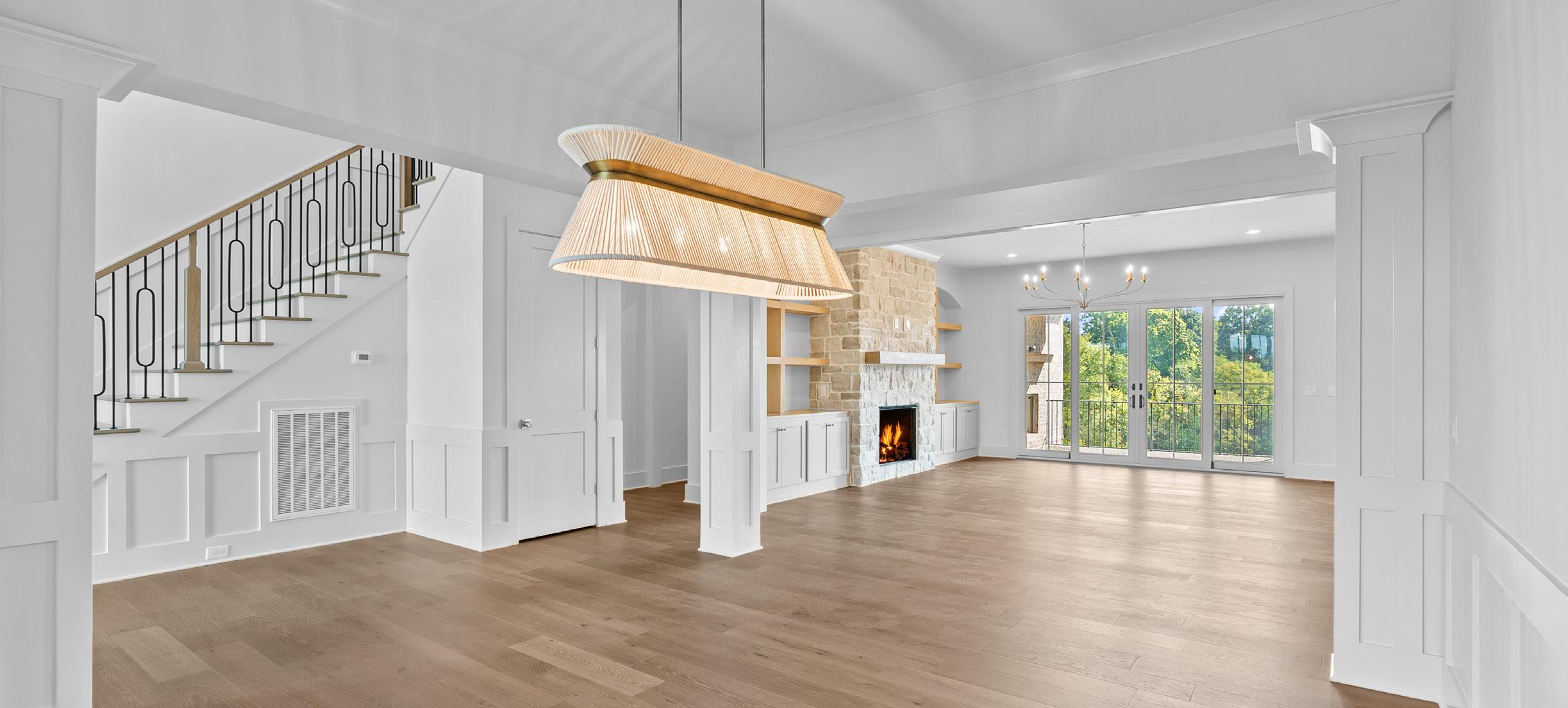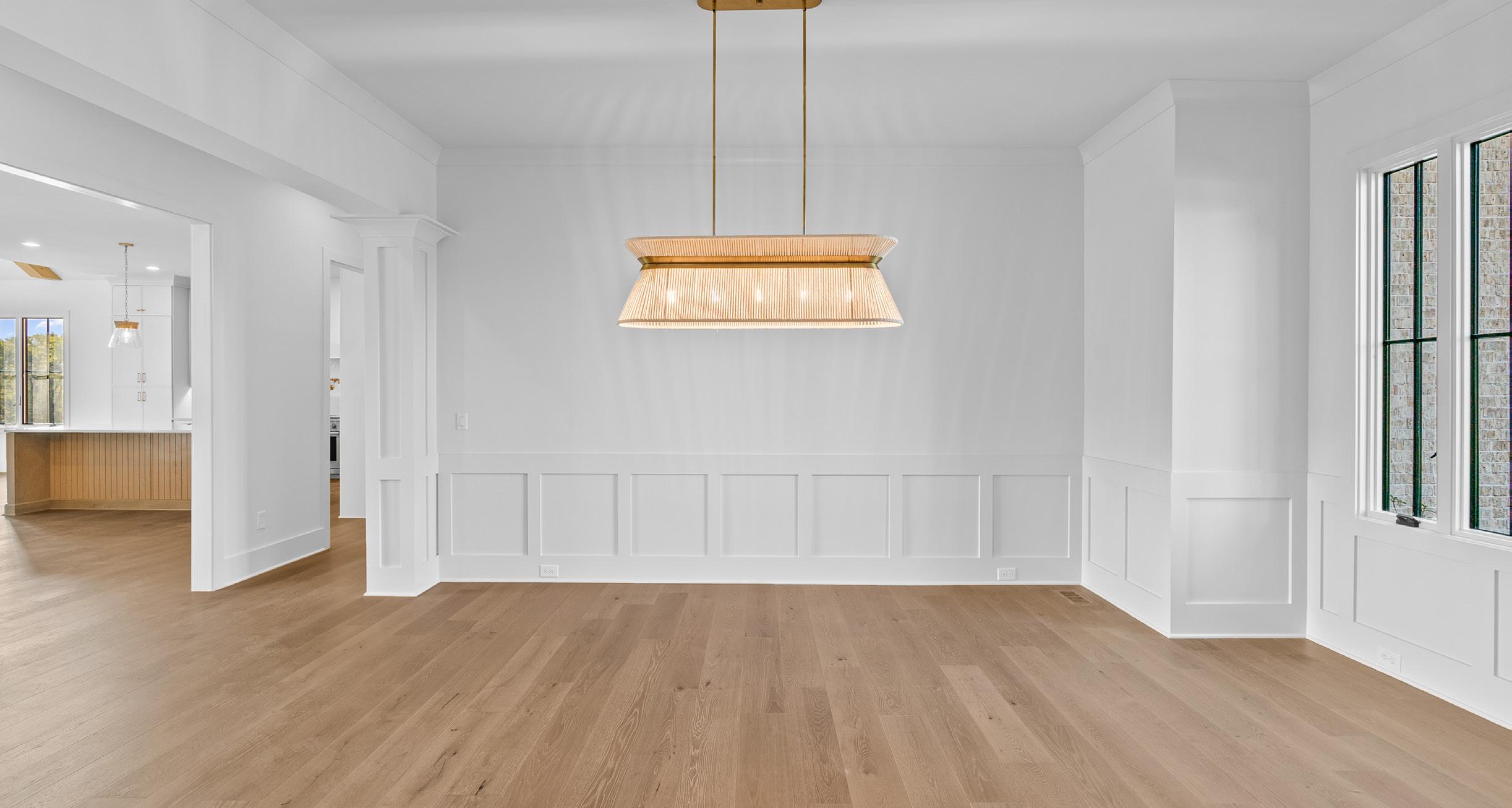 Perfect for intimate dinners or grand gatherings, the open dining room is the epitome of refinement. Featuring casement windows and wainscoting, this space is both airy and inviting. A modern rope and gold linear chandelier above the table area complements the meticulously trimmed columns and crown molding, while its seamless connection to the family room creates an effortlessly flowing floorplan.
