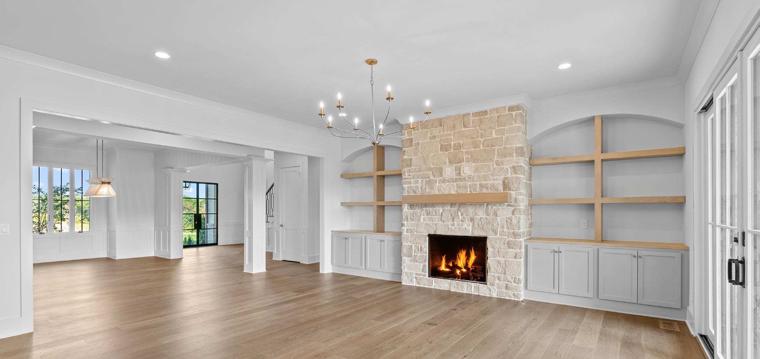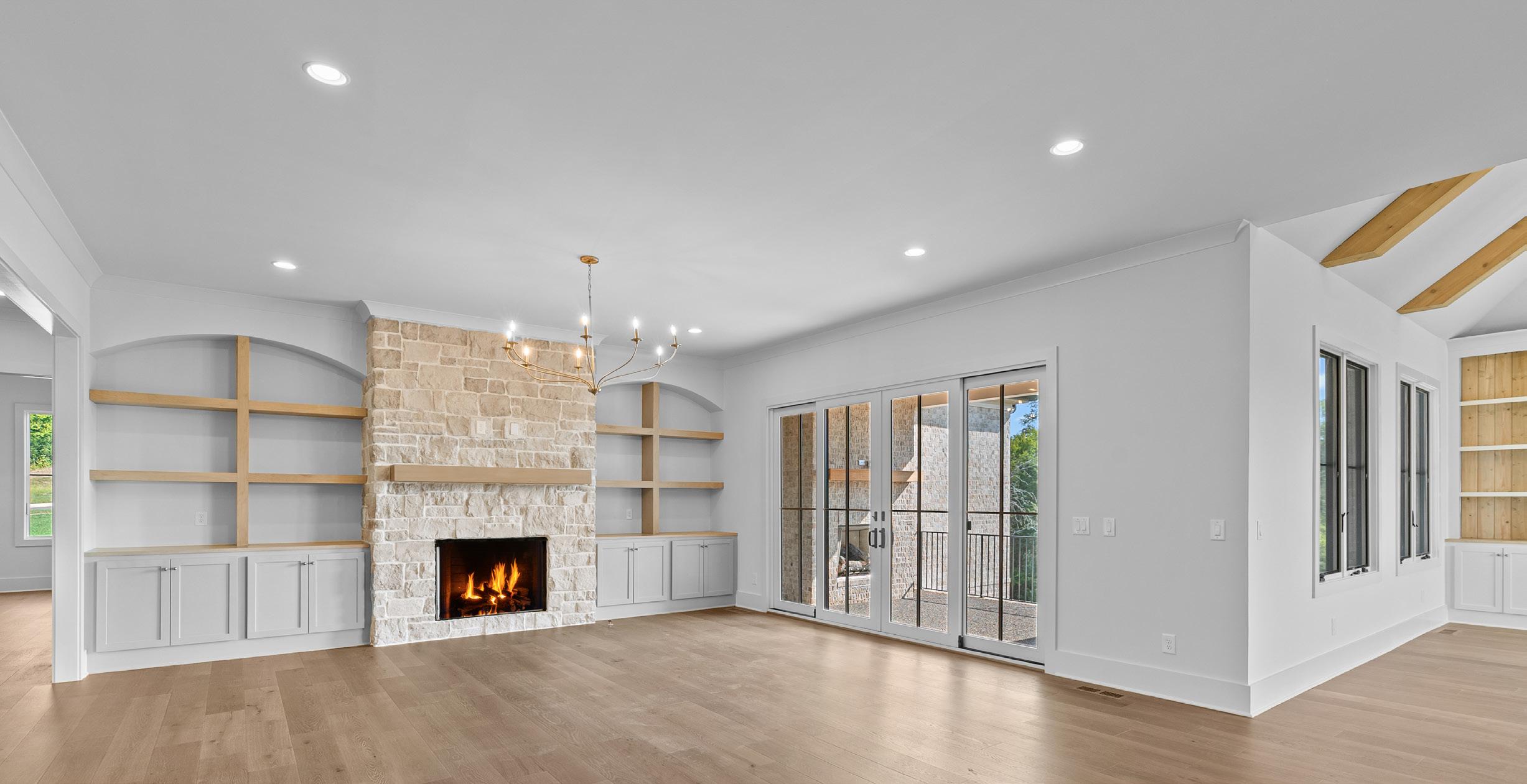 • Expansive Family Room featuring floor-to-ceiling stone fireplace, built-in arched bookcases, and large sliding doors to the porch