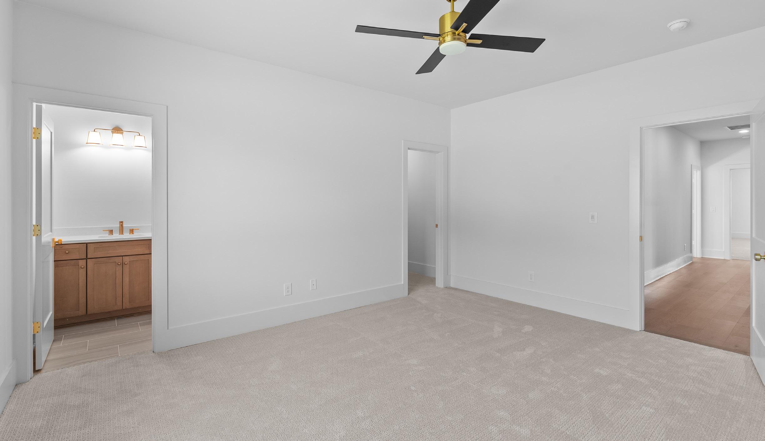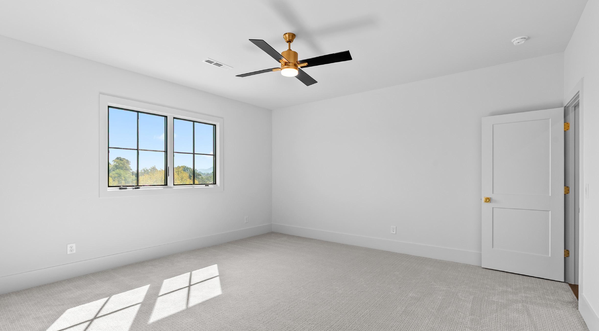 This spacious bedroom offers a serene retreat with casement windows showcasing incredible views of the surrounding hills. Plush sculpted carpeting and a ceiling fan add comfort, while the ensuite bath features a quartz vanity with stained wood cabinetry, gold fixtures, and a tub and shower combo with a frameless glass enclosure and tile surround.