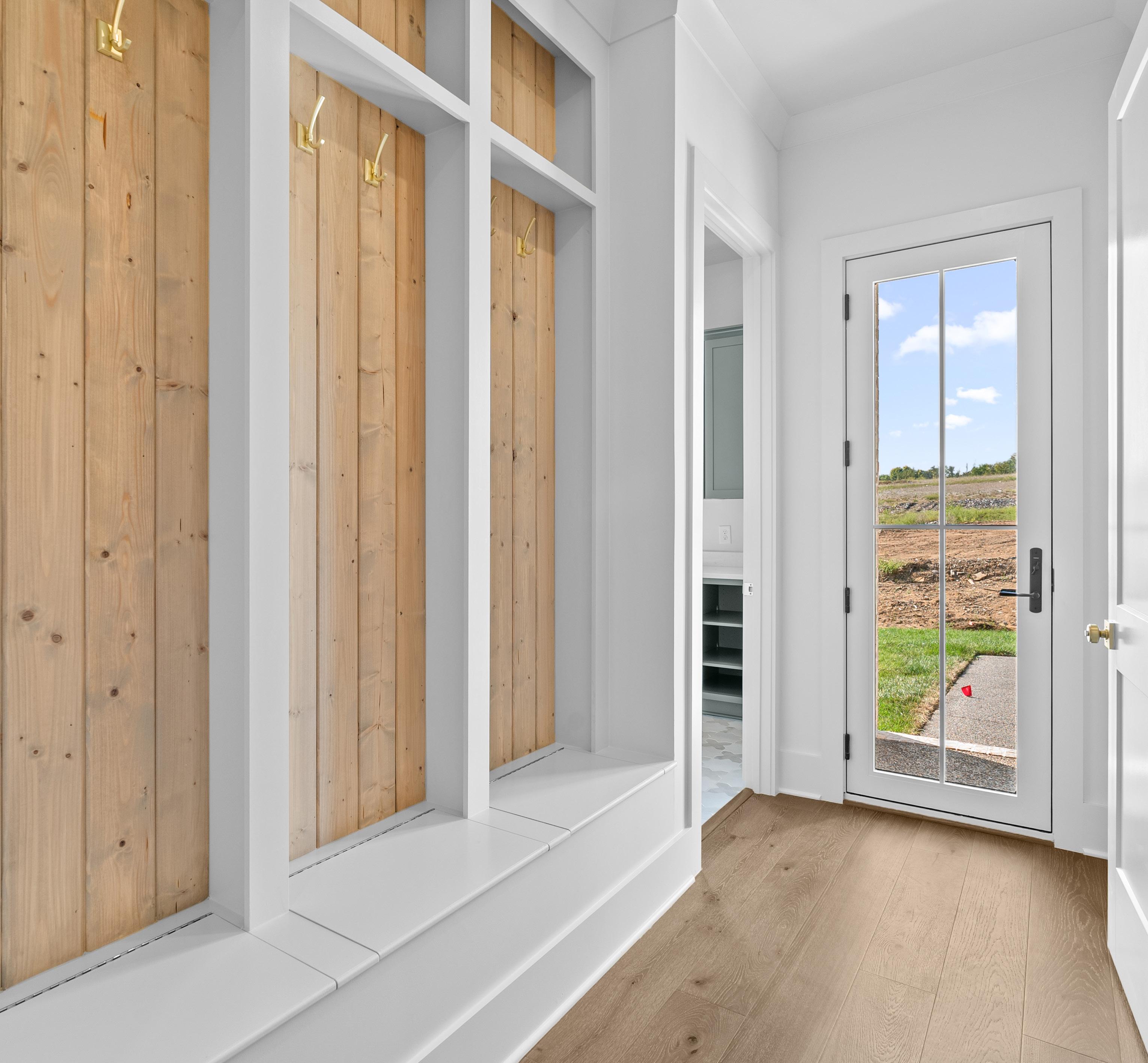 The convenient friend’s entry with access from the driveway offers a glass door and welcoming space with custom cubbies, wood backing, lift-up storage bench and hooks, making it the ideal dropzone for coats, bags, and shoes.
