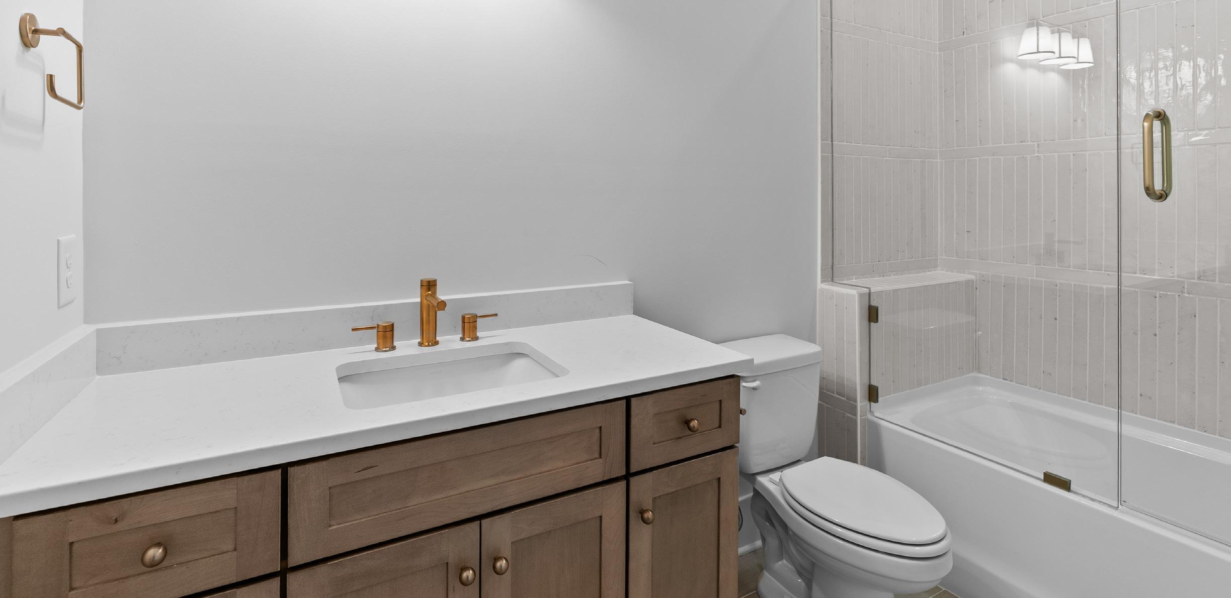 • Separate stained wood vanities with waterfall quartz edges