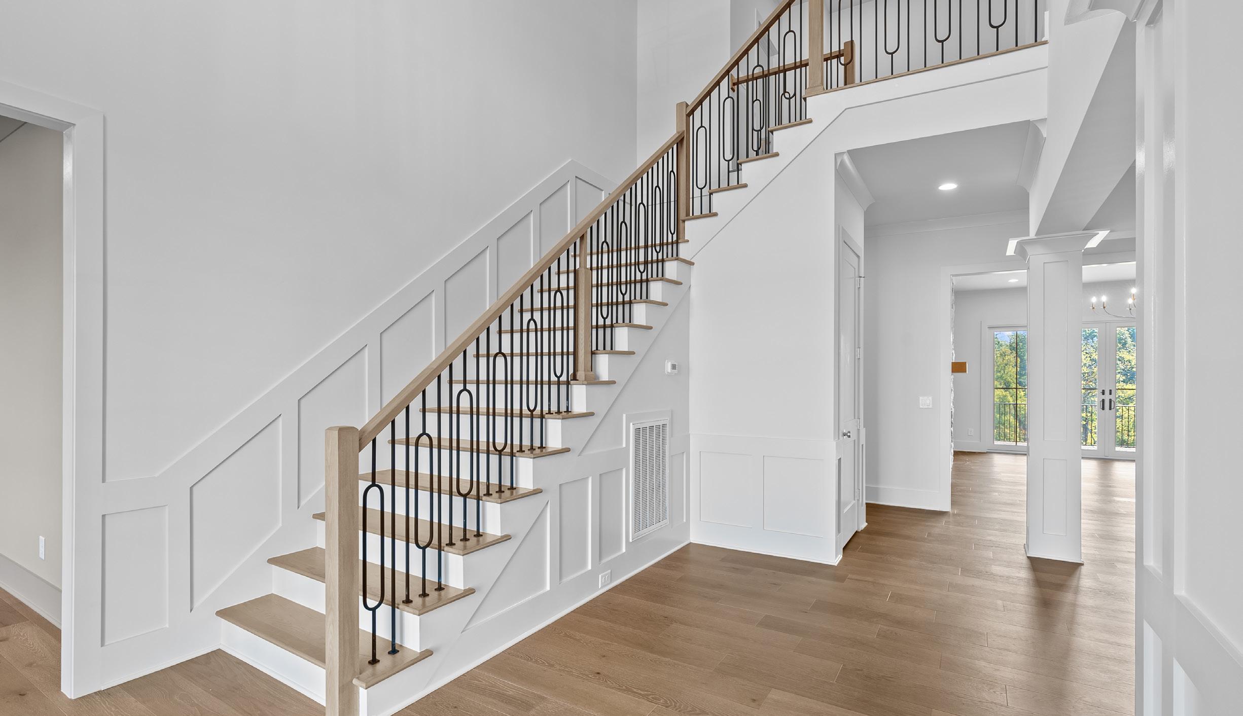• Double Iron Entry Doors opening to a dramatic two-story foyer with wainscoting and statement gold chandelier