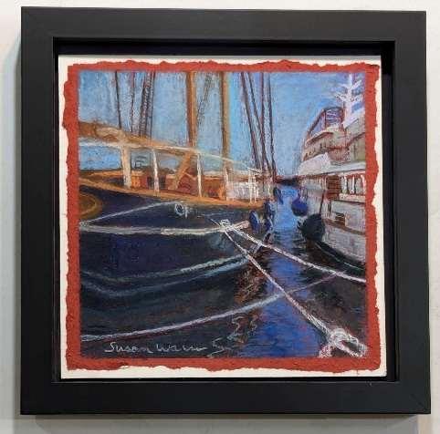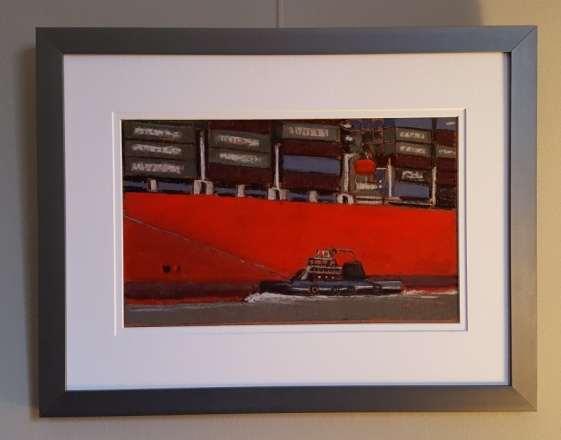 Wewerestrollingalong theriverfrontin SavannahGeorgia,when thishugecontainership camethrough,pulling whatlookedlikeatiny boatalongside.Itwas incredibletowatchthem maneuverthatgigantic shipthroughthenarrow riverandunderthe bridge.Iwasexcitedto usesomeofmymanyred pastels,soIchangedthe boatcolorfromgreento red.