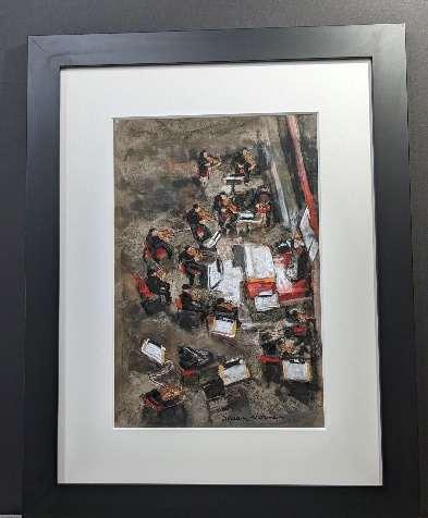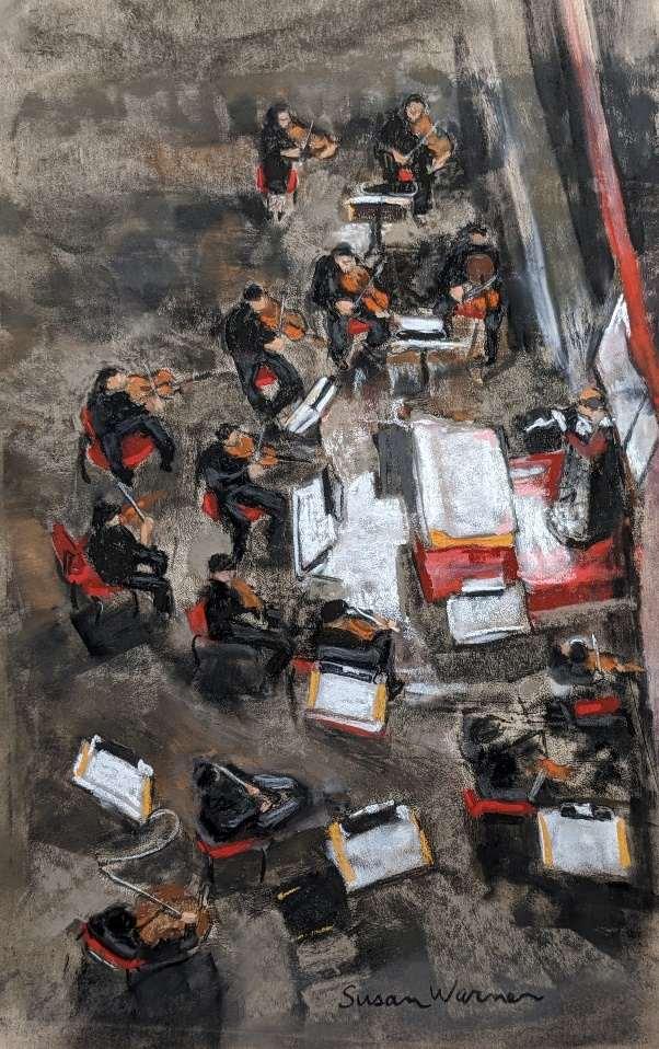 Weattendedaperformanceof“TheMarriage ofFigaro”attheTheatroMassimoBeliniin Catania,Sicily.Weboughtourticketstheday beforetheperformance,sowehadtotake whatwasleft.Theboxthatourseatswerein wasclosesttothestageontheleftside.We hadtoleanouttoseetheperformersonstage. Instead,Iwatchedtheorchestrabelowme.I lovethebirds-eyeperspectiveofthispainting.