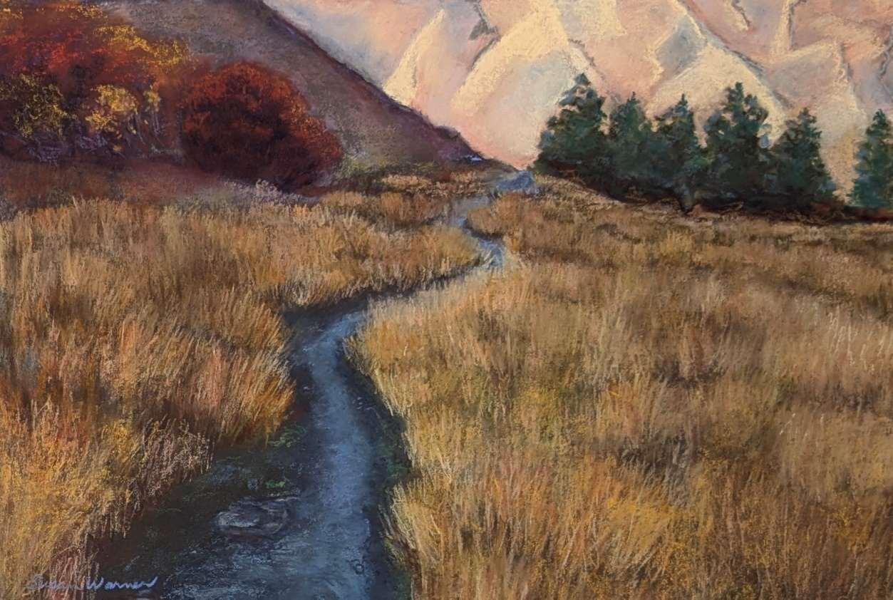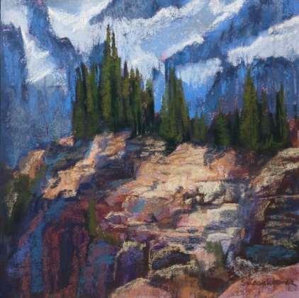 Mile,MileandaHalf–Thispaintingisan intersectionbetween mylife-longloveofthe outdoorsandmymore recentdiscoveryof pastels.Thetitle“Mile, MileandaHalf”isfrom abackpackingmovieof thesamename.Itisa lightheartedanswerto thehiker’squestion “howmuchfarther?”