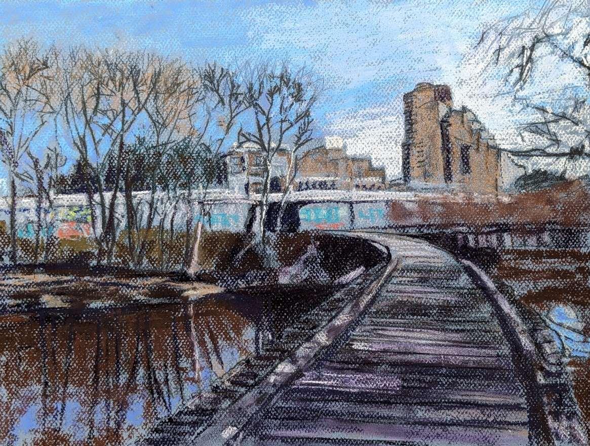 IrarelyuseCanson traditionalpastelpaper, butitworkedwellfor thismonoprint(trace montype)withpastel. Thebridgeisnearour condobuilding-youcan seeitinthebackground. Itisanoldrailroad bridgeandthereis nothingbutairbetween theties.