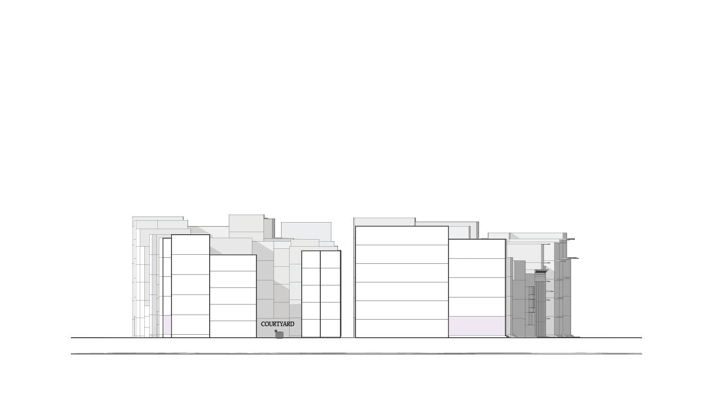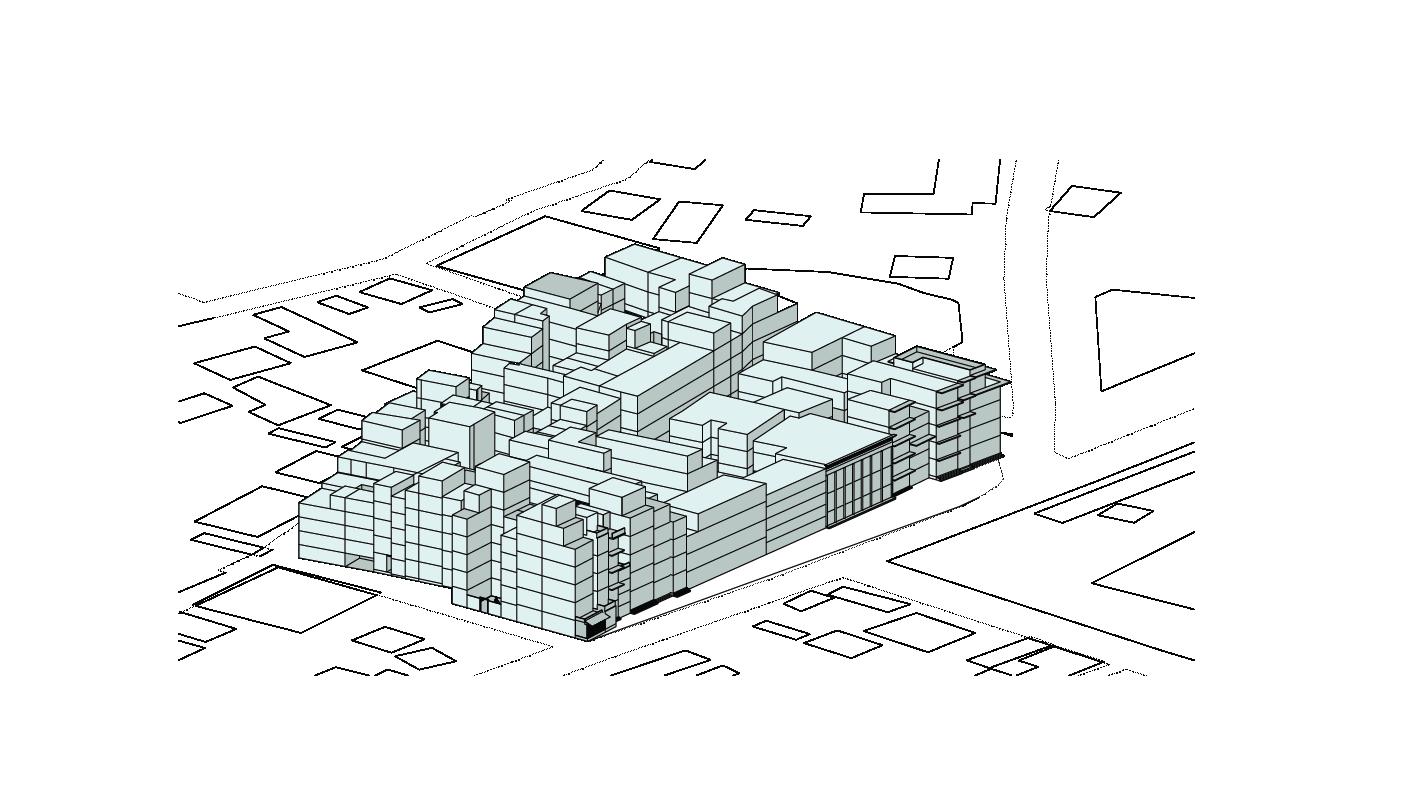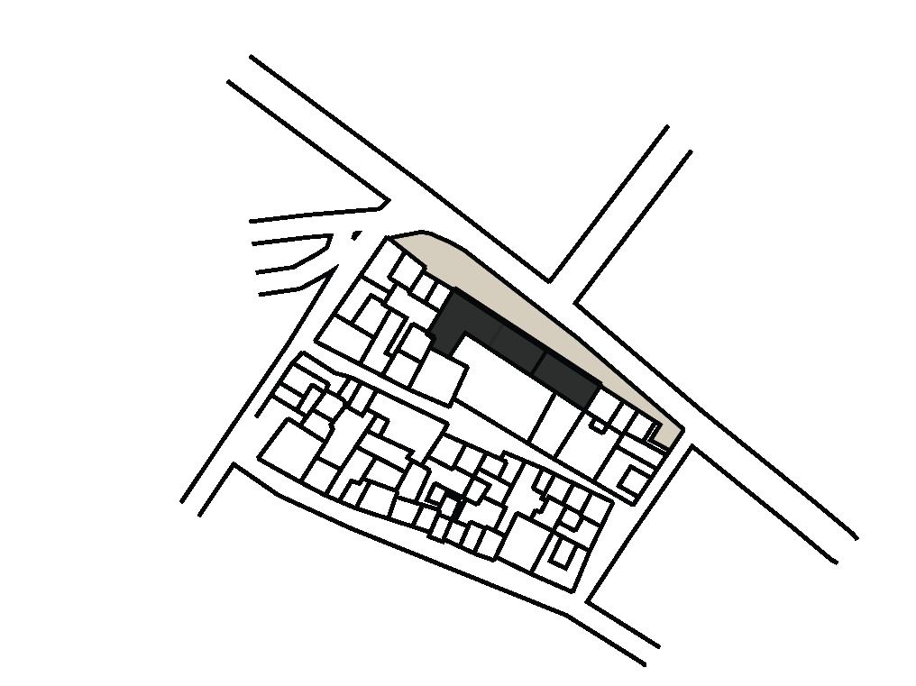 The block is aligned to the site’s contour flow, with circulation directed toward the lower northern side for easy access and visibility.