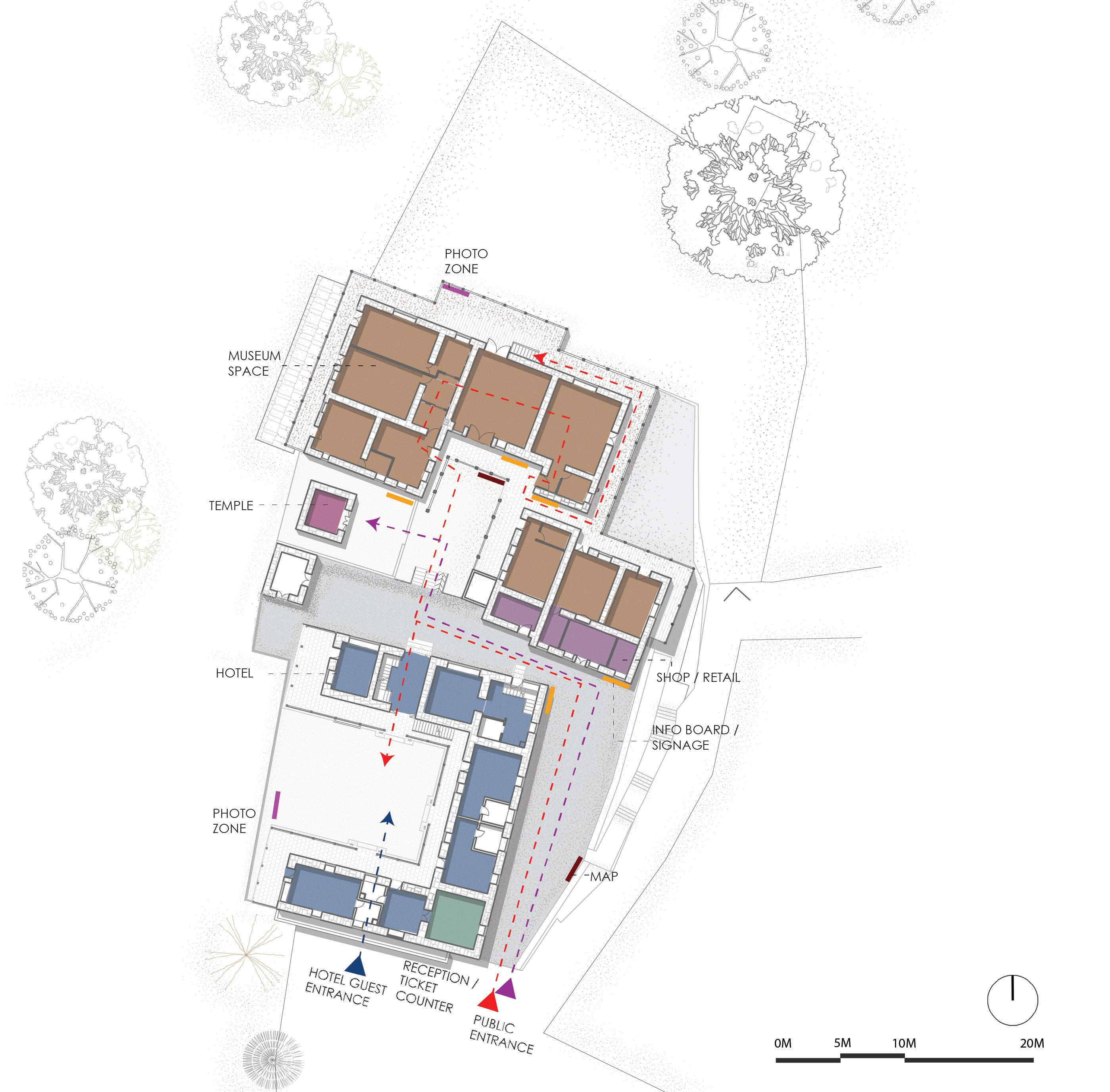 The proposed masterplan systematically organizes circulation, spatial functions, and wayfinding across the Naggar Castle precinct to create a coherent and efficient layout. Distinct movement patterns are established for visitors and hotel guests, beginning at separate entrances and converging at key activity nodes such as the reception, museum areas, temple courtyard, and open photo zones. This structured flow enhances legibility and ensures that users experience the site in a logical and uninterrupted sequence. The zoning framework clearly delineates heritage spaces, hospitality functions, service areas, and retail edges, allowing each component to operate effectively while maintaining the cultural integrity of the complex. Complementing this, signage and information boards are positioned along primary routes to support orientation, mark transitions between zones, and highlight significant points of interest. These elements together provide clarity in navigation and strengthen the interpretive quality of the site. Overall, the masterplan establishes an integrated spatial strategy that respects the castle’s historic character while improving accessibility, visitor engagement, and the functional performance of the precinct.