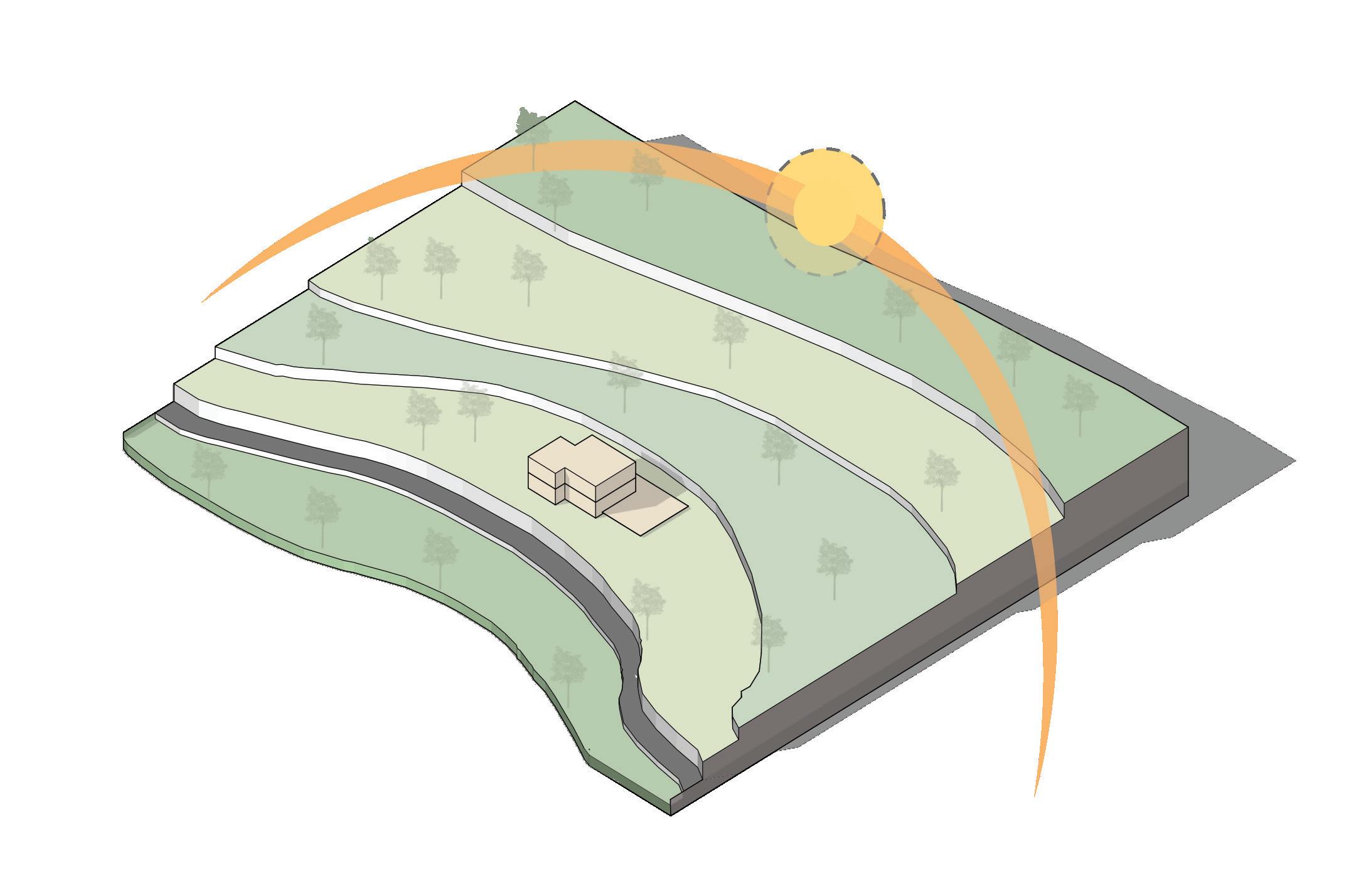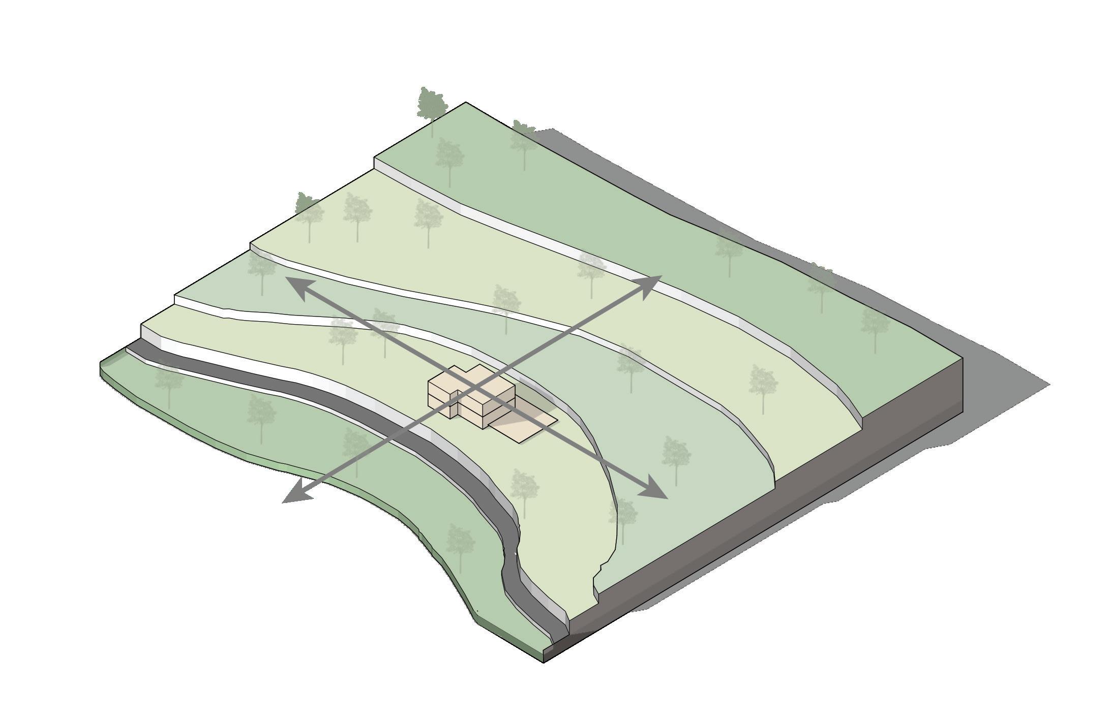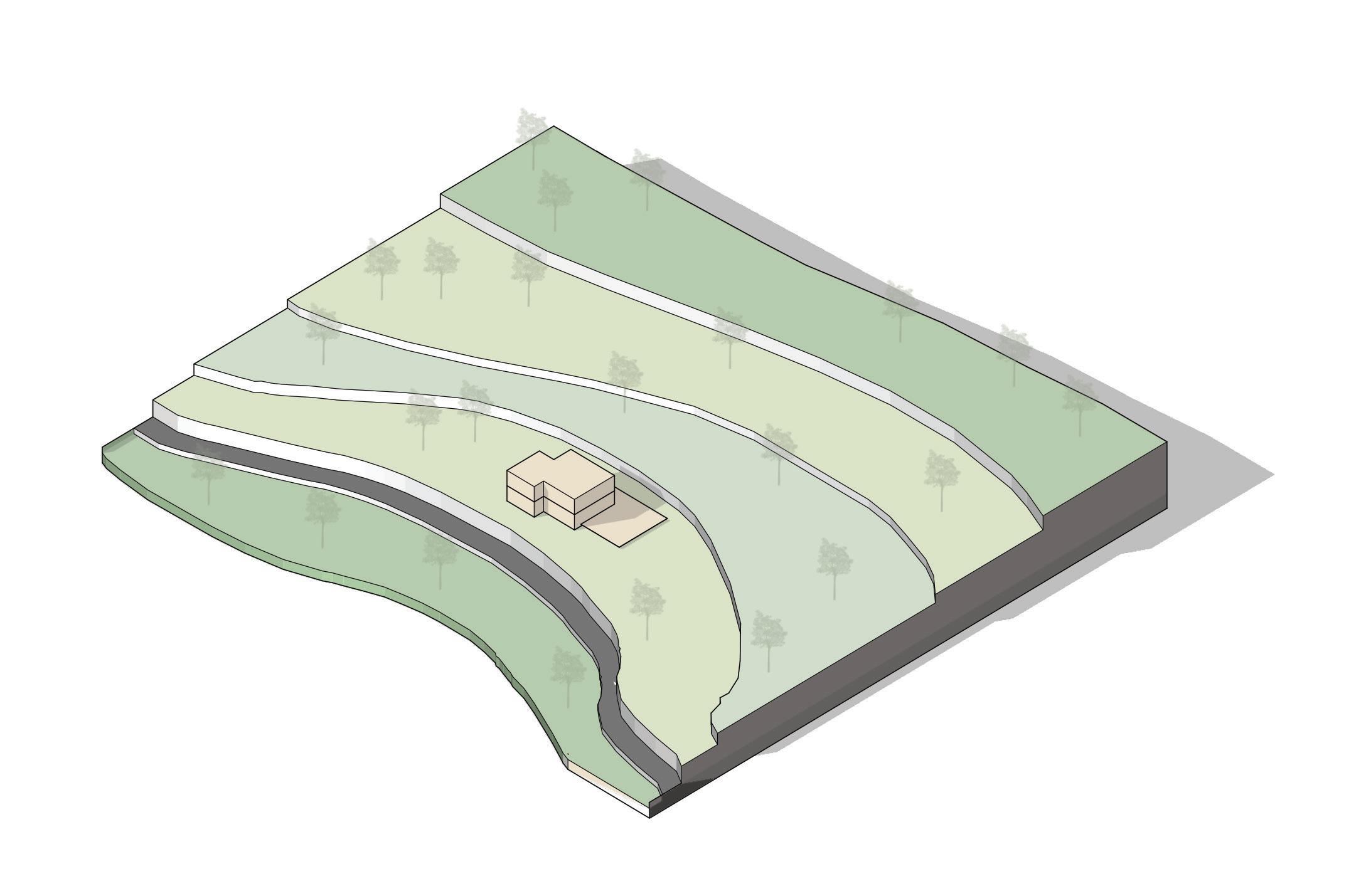 The structure steps along the descending terrain, minimizing cut-and-fill while maintaining harmony with the natural terraces.