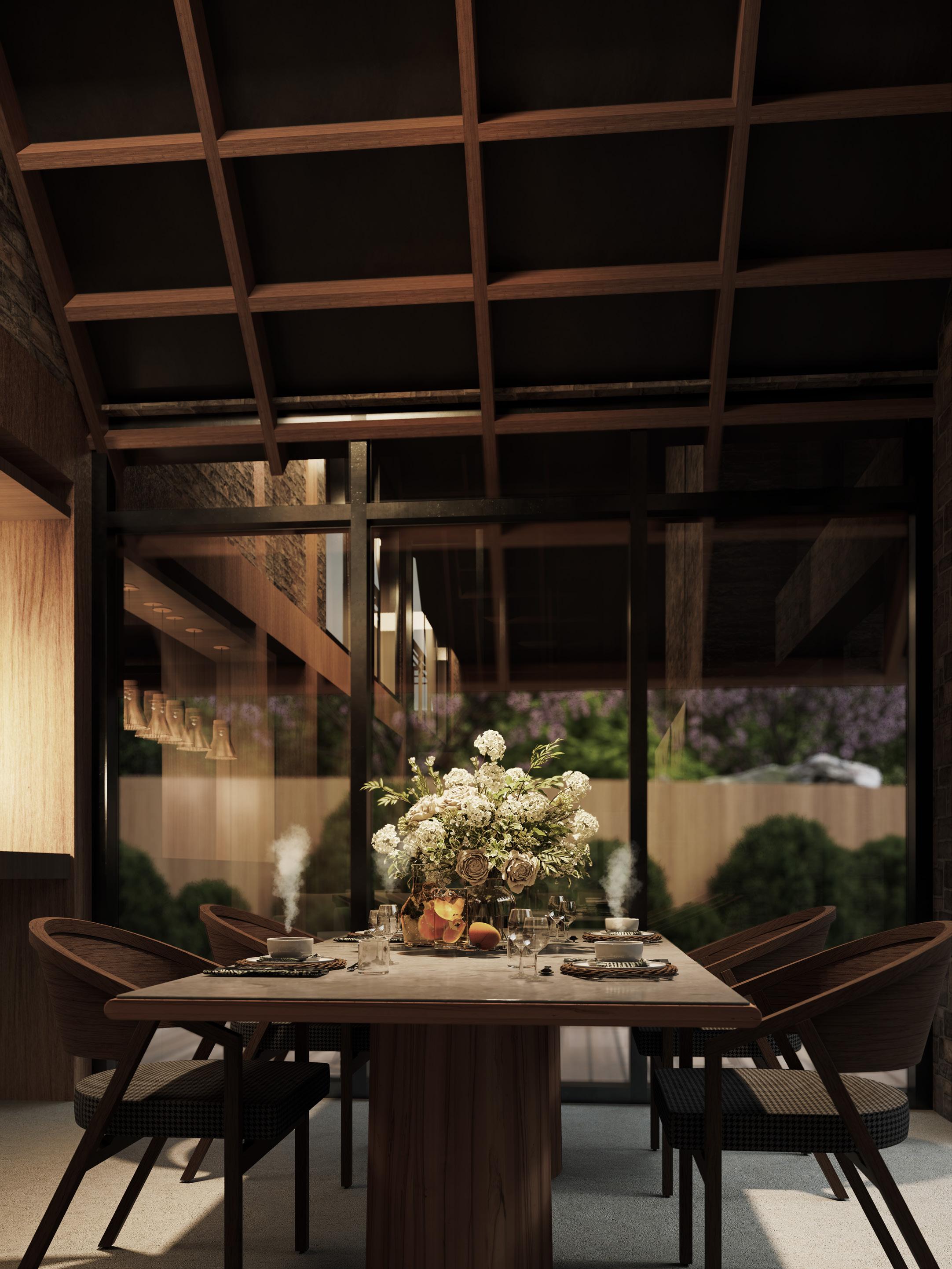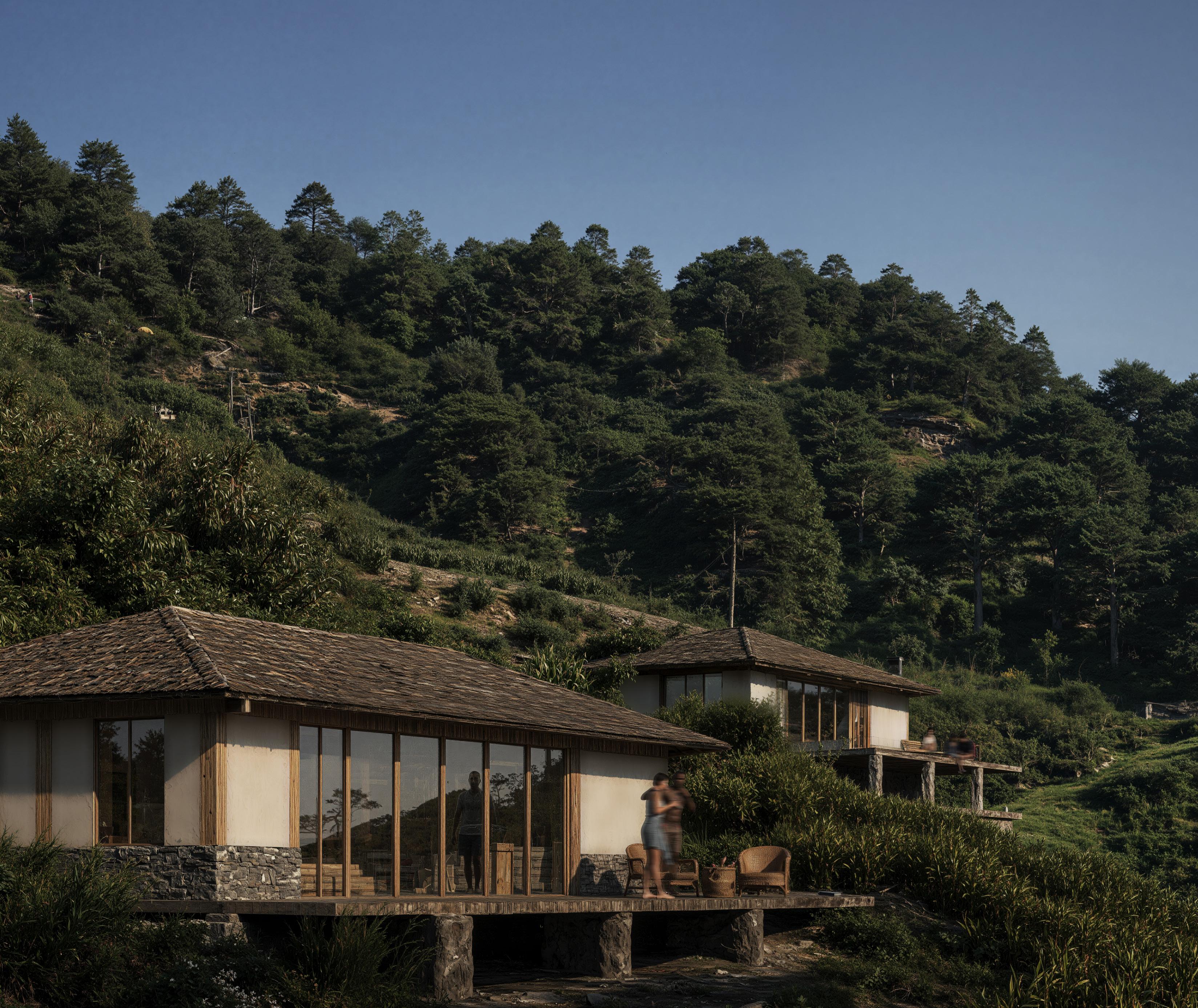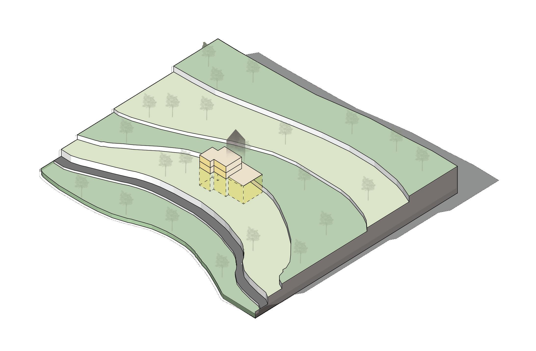 The structure steps along the descending terrain, minimizing cut-and-fill while maintaining harmony with the natural terraces.