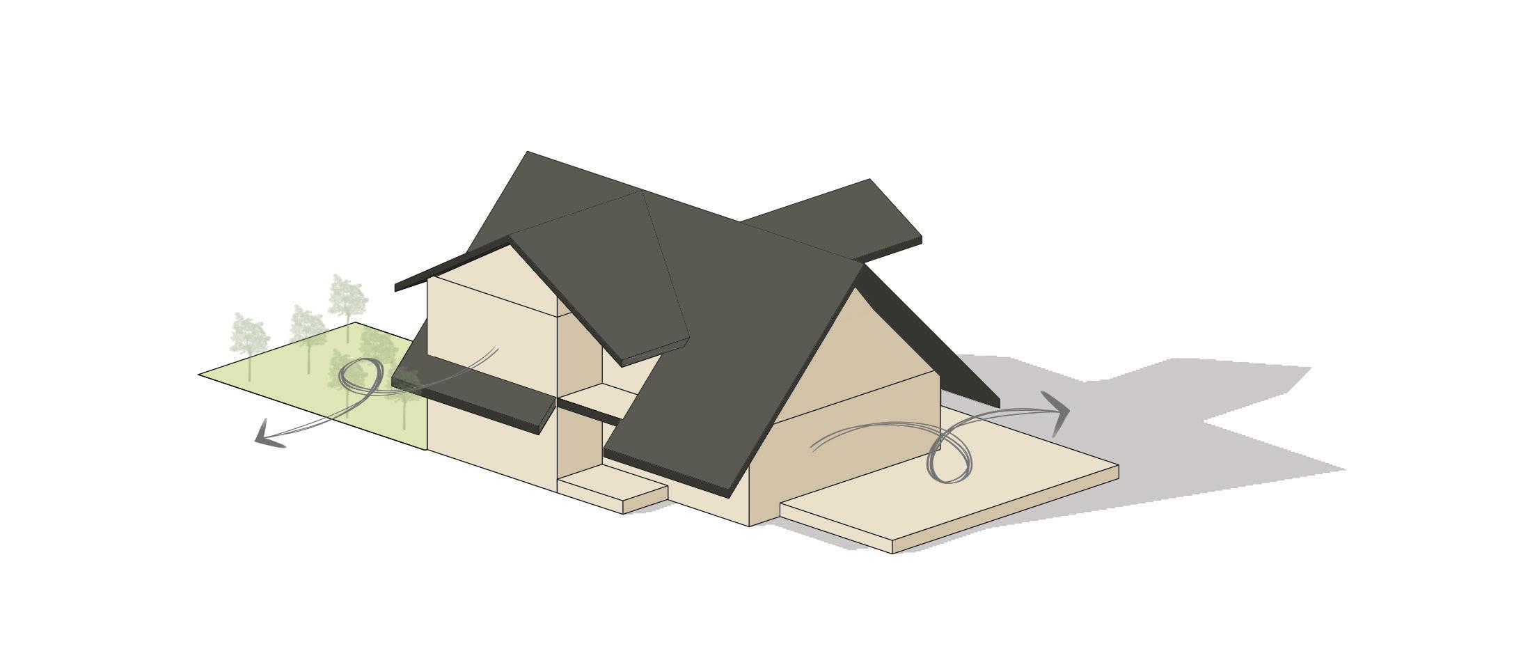 The house opens towards the east and west to capture morning and evening light, while the southern side receives soft daylight throughout the day.