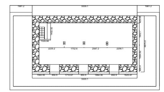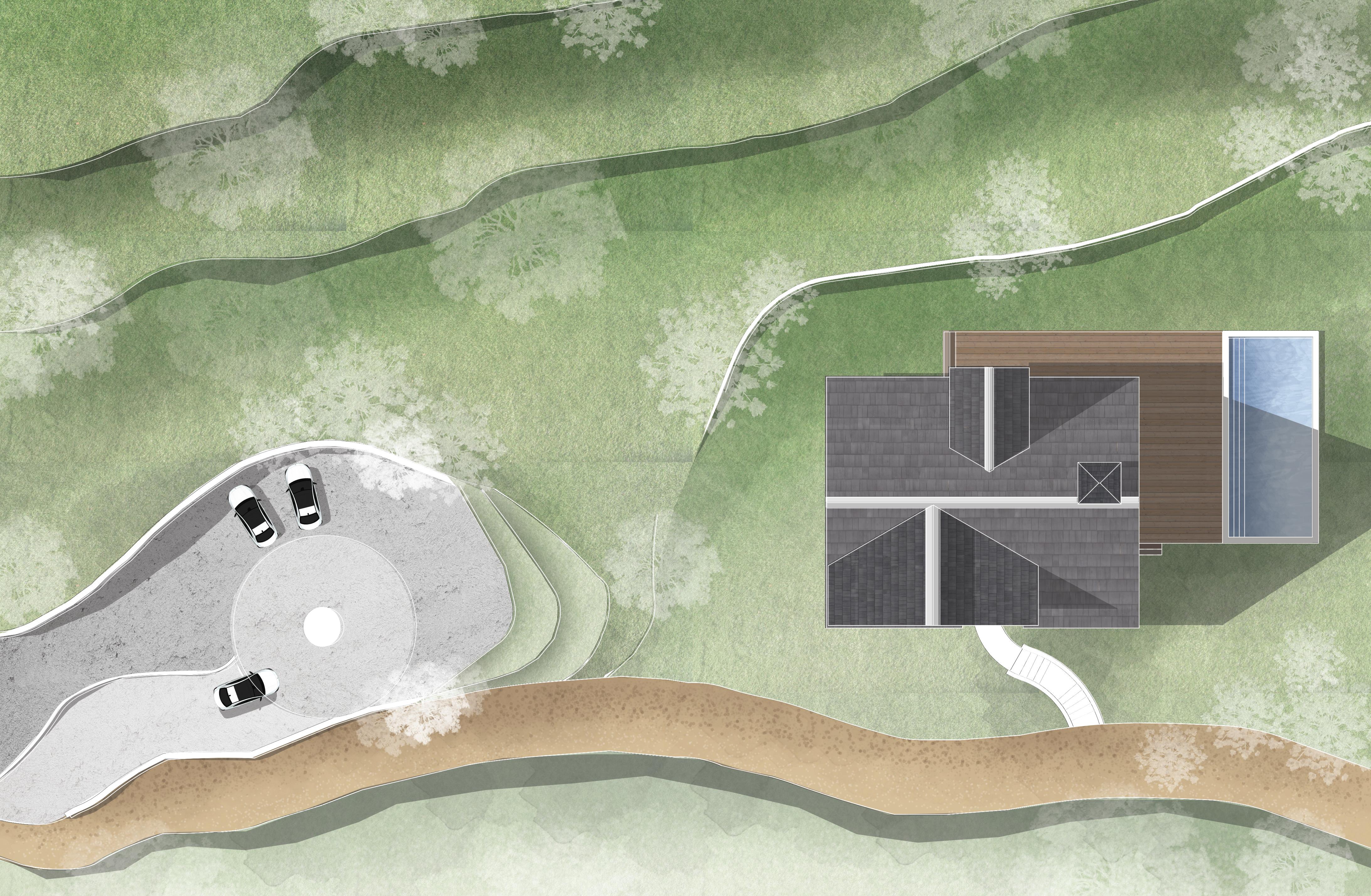 A compact rectangular block is placed along the natural terrace, responding to the site’s slope and forming the core volume of the residence.