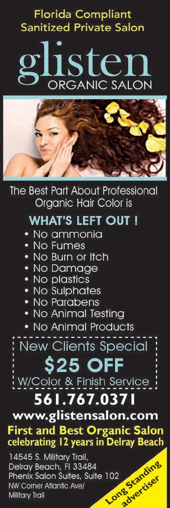 “Where nature and beauty meet.” A hidden jewel in the heart of Central Delray. Come and relax in the serene, private environment while receiving the finest in organic and conventional services and products. Let our experience and professionalism guide you to Delray’s First and Best Organic Salon. Celebrating 13 years! See ad page 25