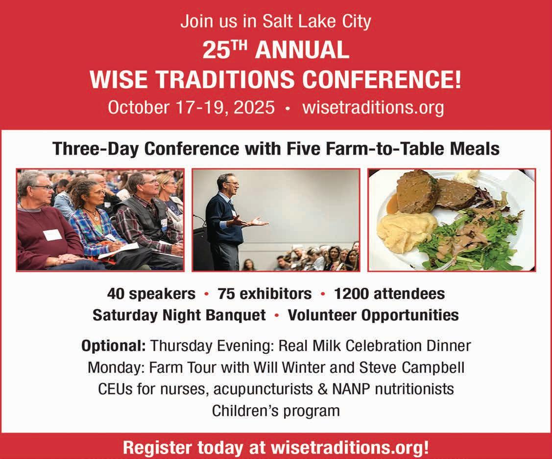 This is a conference that nourishes you in every way: enjoy nutritious food, learn healing wisdom, meet new friends, be inspired. WiseTraditions.org for info and to register. See ad page 21.
