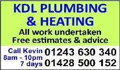 PLASTERING OVEN CLEANING PLUMBING / HEATING KDL PLUMBING & HEATING Immersion heaters, Cylinders, Taps, Toilets, Showers, Heating problems, Ballvalves and more. 01243 685516 01903 430174 MOBILE: 07475 128249 PRIVATE HIRE / TAXI PLUMBING / HEATING ROOFING PET / ANIMAL SERVICES PLUMBING / HEATING Robbie Scott Plumbing & Heating