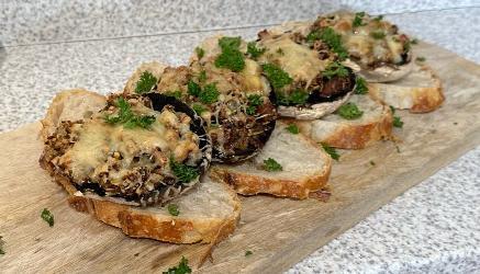 3. Remove from the heat and add the oats and seasonings to the pan, mix well so the pan juices start to absorb into the oats. Spoon the mixture into the hollows of the mushrooms and sprinkle with the grated Comté cheese.