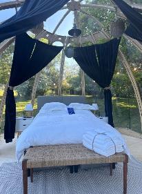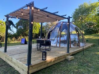 After meeting the sheep, who seemed very curious about their new neighbours, we were treated to a relaxing al-fresco dinner on our private terrace looking over the sun dappled hills to the Jack and Jill windmills above Pycombe. Our cosy dome was fully equipped with a king-sized state-of-theart bed and Emma memory-foam mattress,
