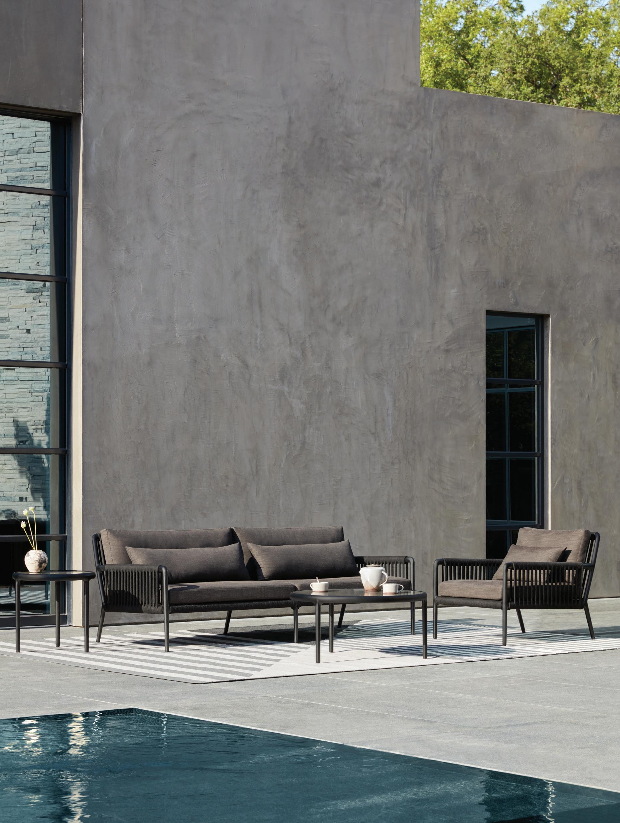 above (left to right): Otti Round Occasional Table, Three-Seat Sofa (across), Medium Round Coffee Table and Lounge Chair. Cushion and pillow fabric, rug, and woven rope by Perennials.