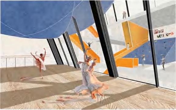 The tower provides the highest view point of the surrounding area. The horizontal building accommodates neighborhood life