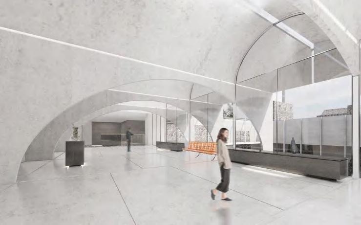 To maximize the value of ruins, the new contemporary exhibition box is floating on the old church fragments: The ground floor is totally opened and used as an outdoor exhibition area protected by arched partitions; the upper floor is divided by arch modular walls and used as a contemporary museum