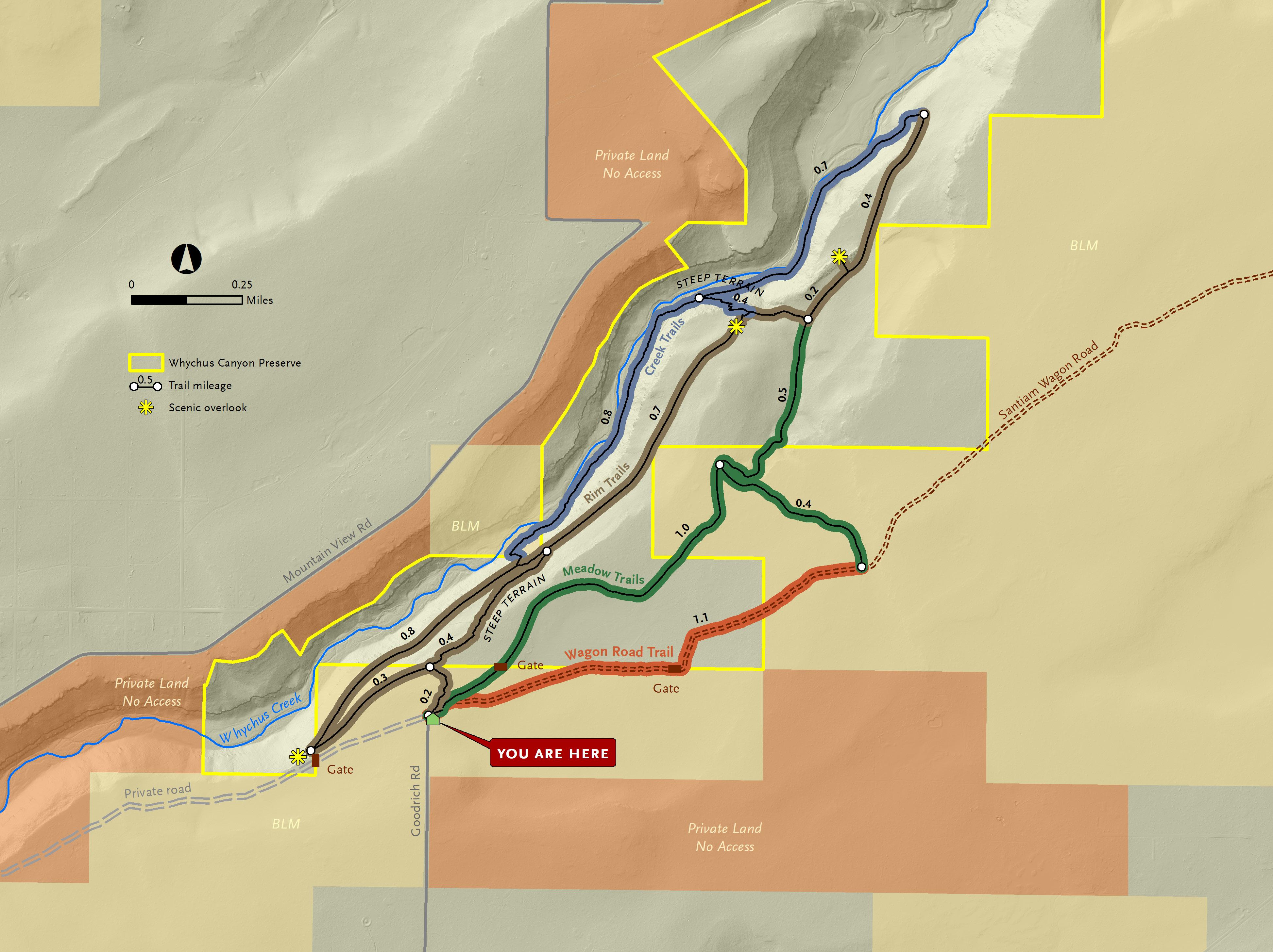 From the trailhead, follow signs to Rim + Creek Trails. At the first junction, turn right and head down a steep route into the canyon for 0.4 miles. At the next junction, follow signs for the Rim Trail and turn right. After 0 7 miles along a rolling mid-canyon trail, you will reach a scenic overlook and bench with views into the northern portion of Whychus Canyon Preserve. Continue past the overlook to the next junction and turn right. After 0.2 miles you’ll reach another intersection. Turn left to add a quick 0.4 mile detour to another overlook. Or, turn right and follow signs for Meadow Trails and Trailhead for 1.5 miles back to the trailhead. Total Distance: 3.0 mile loop.