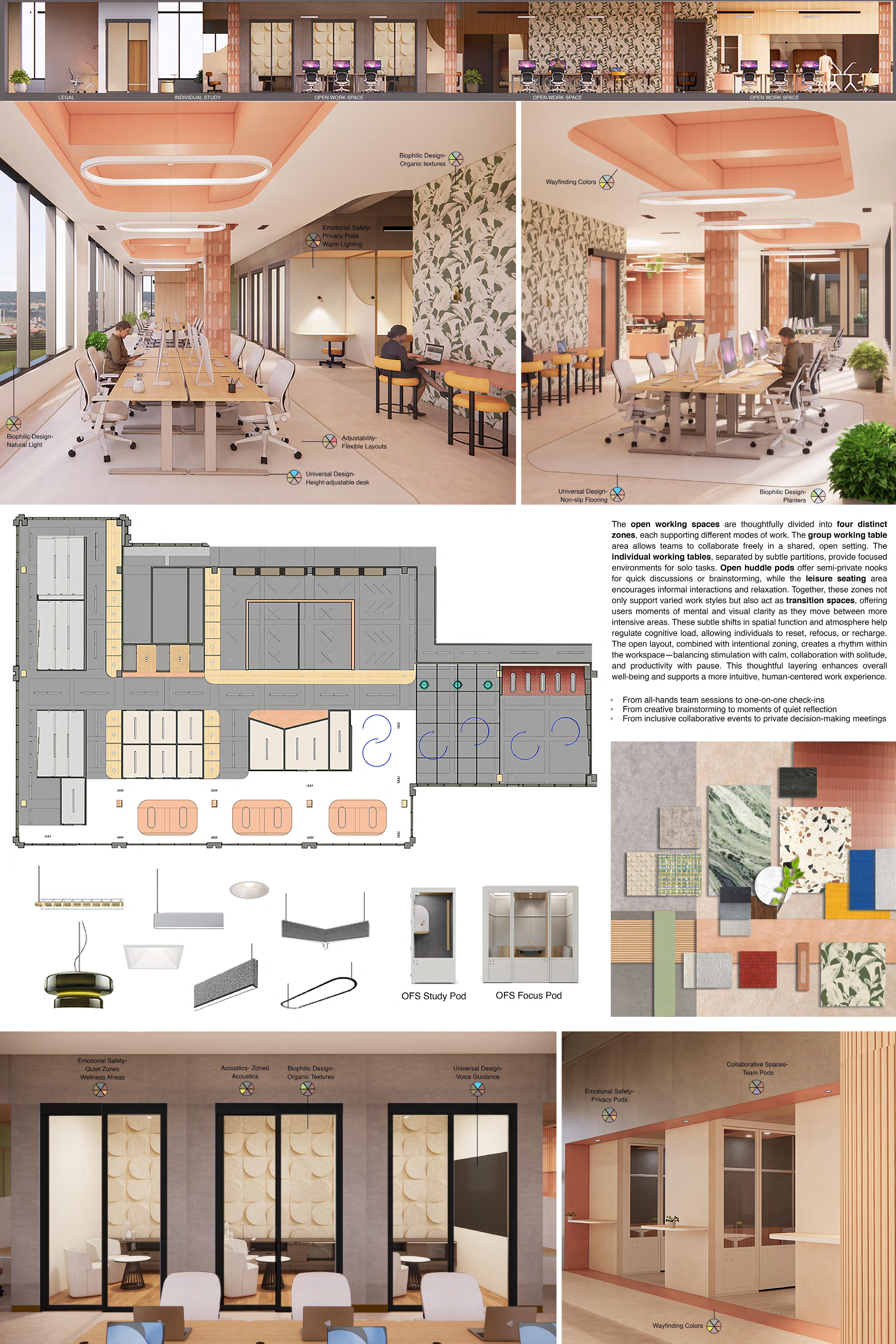 In a typical office environment, the absence of nature integrati on often leads to elevated stress levels and diminished overall well-being. Physical barriers can limit accessibility, making it difficult for employees with disabilities to navigate the space with ease. Uniform, rigid workspaces fail to accommodate the diverse needs and working styles of today’s workforce. For neurodivergent individuals, overstimulating or stressful environments can severely hinder emotional health. In addition, inefficient collaboration zones can either cause overcrowding or lead to isolation, while poor acoustics and unclear wayfinding increase distractions and confusion.That’s why shape-shifting environments flexible, adaptive spaces that respond to users’ needs—are essential for creating inclusive, healthy, and high-performing workplace.