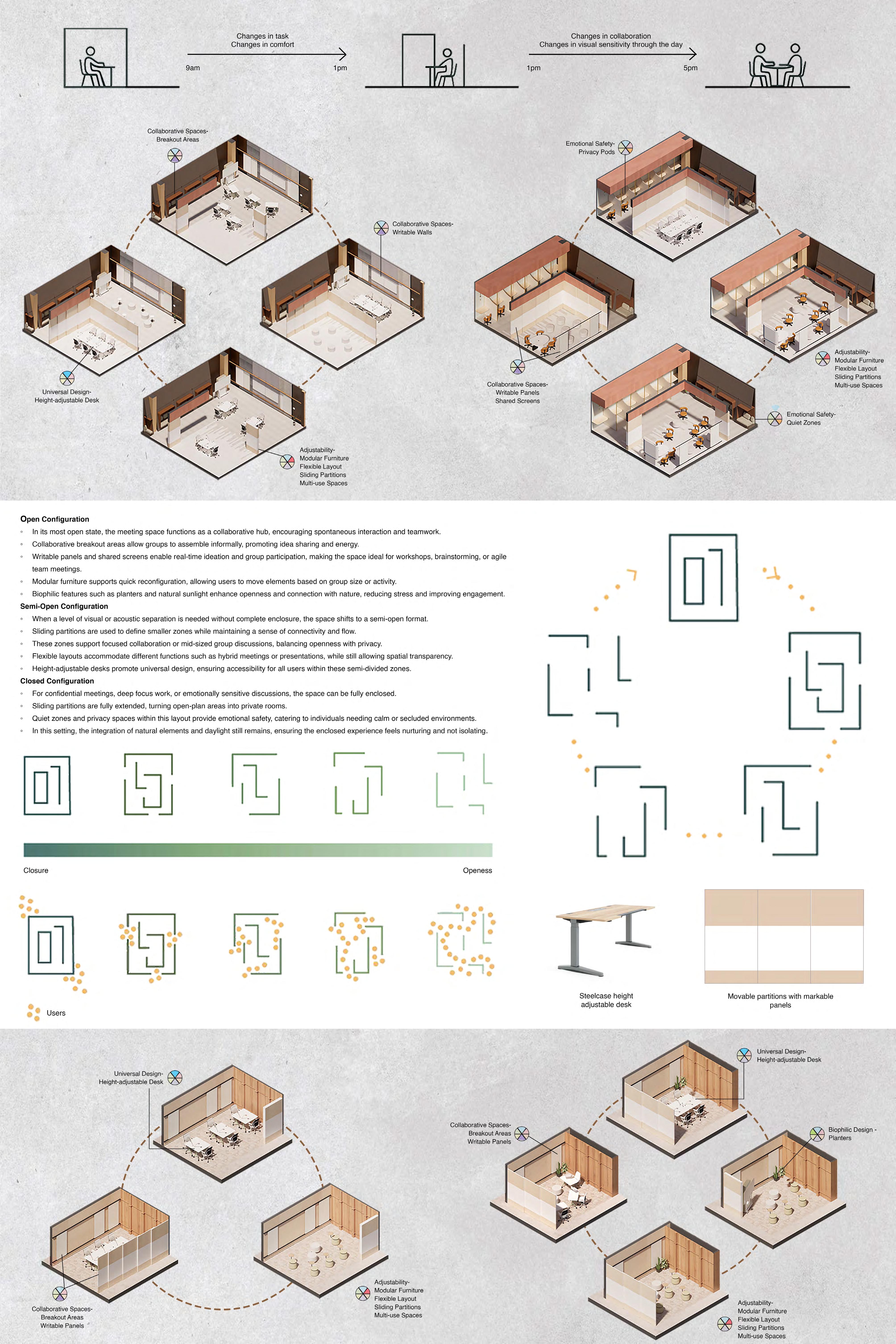 Semi-Open Configuration : Sliding partitions create flexible zones for focused collabora tion and hybrid meetings, balancing connectivity with privacy and ensuring accessibility.
